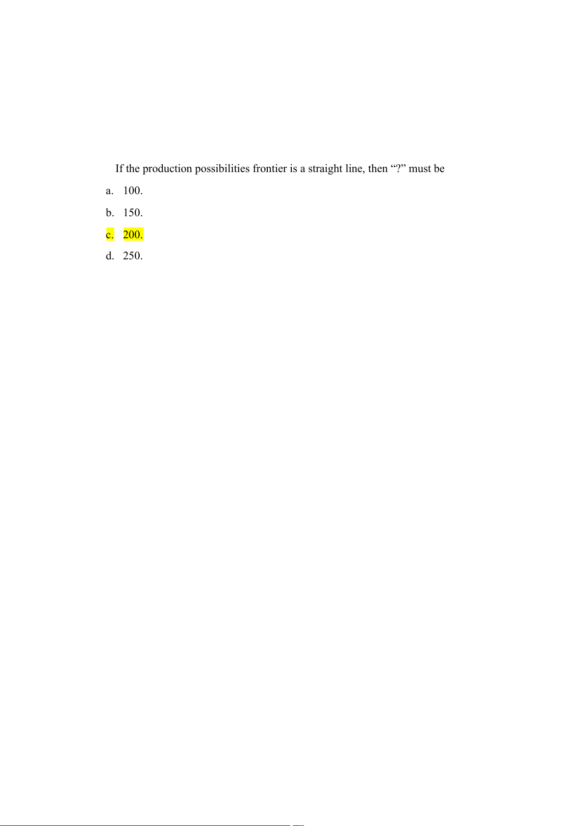 If the production possibilities frontier is a straight line, then “?” must be a. 100. b. 150. c. 200. d. 250.