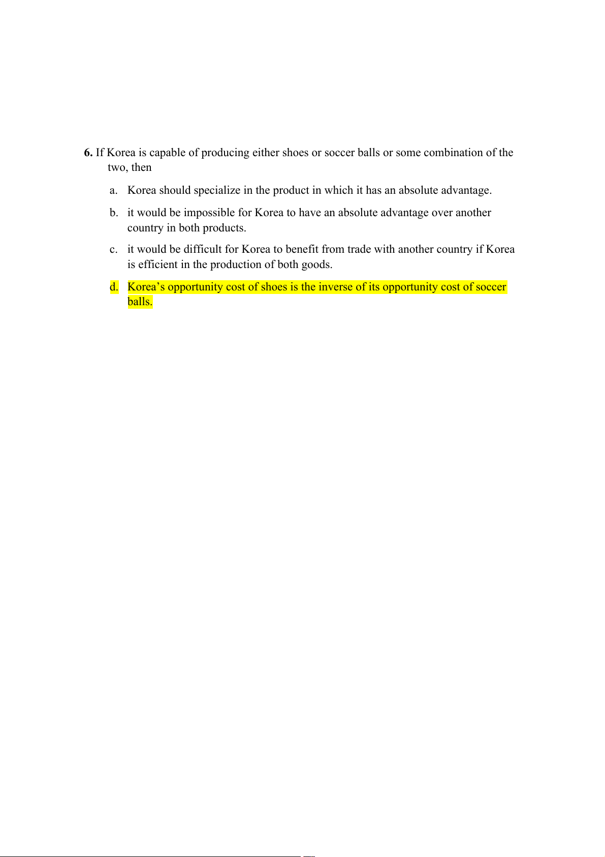 d. Korea’s opportunity cost of shoes is the inverse of its opportunity cost of soccer balls.