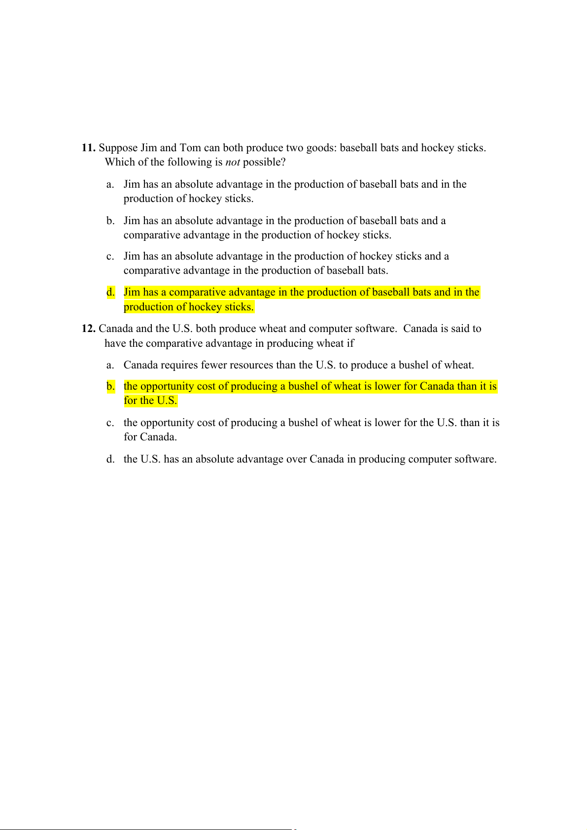 11. Suppose Jim and Tom can both produce two goods: baseball bats and hockey sticks.