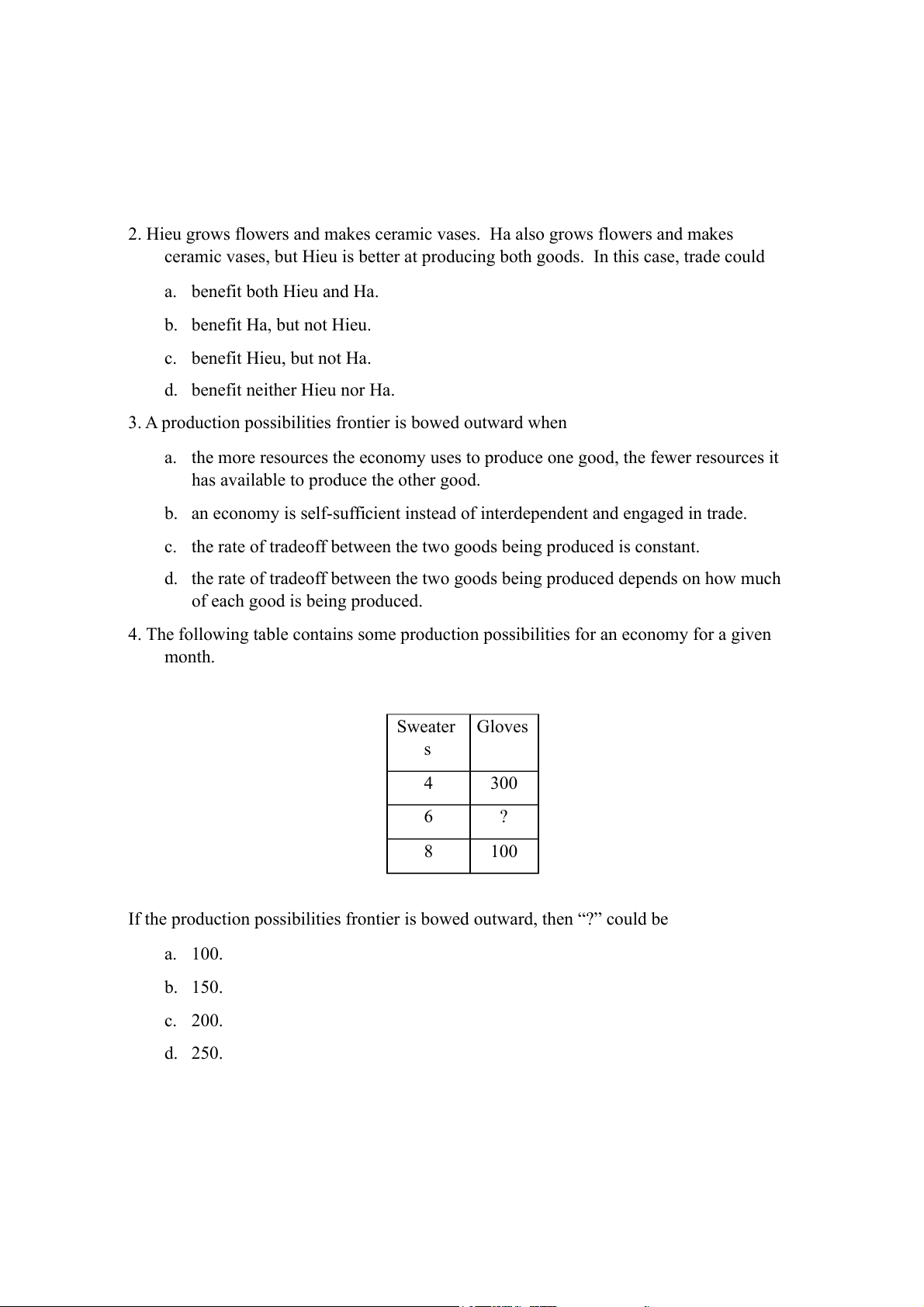If the production possibilities frontier is bowed outward, then “?” could be a. 100. b. 150. c. 200. d. 250.