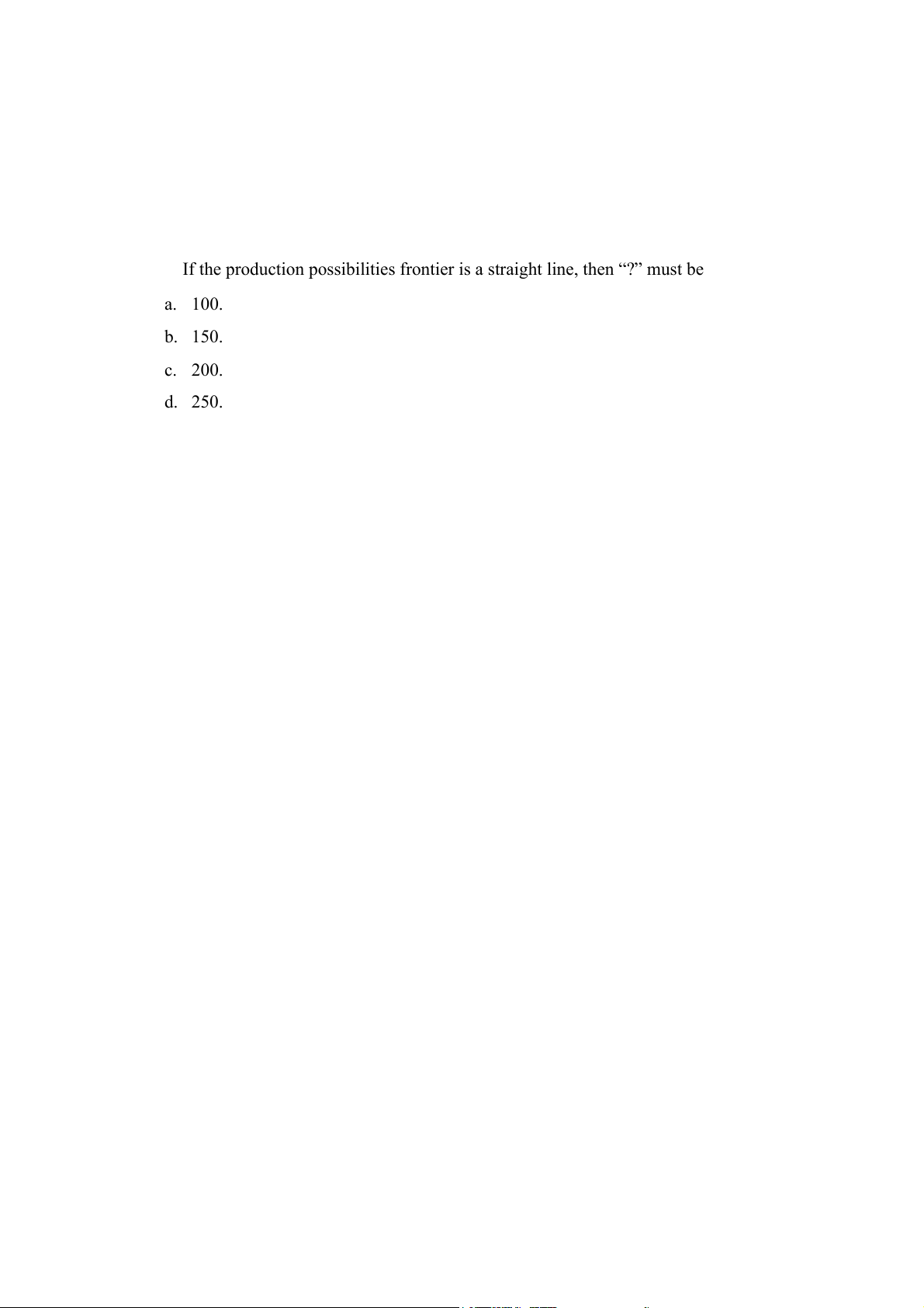 If the production possibilities frontier is a straight line, then “?” must be a. 100. b. 150. c. 200. d. 250.