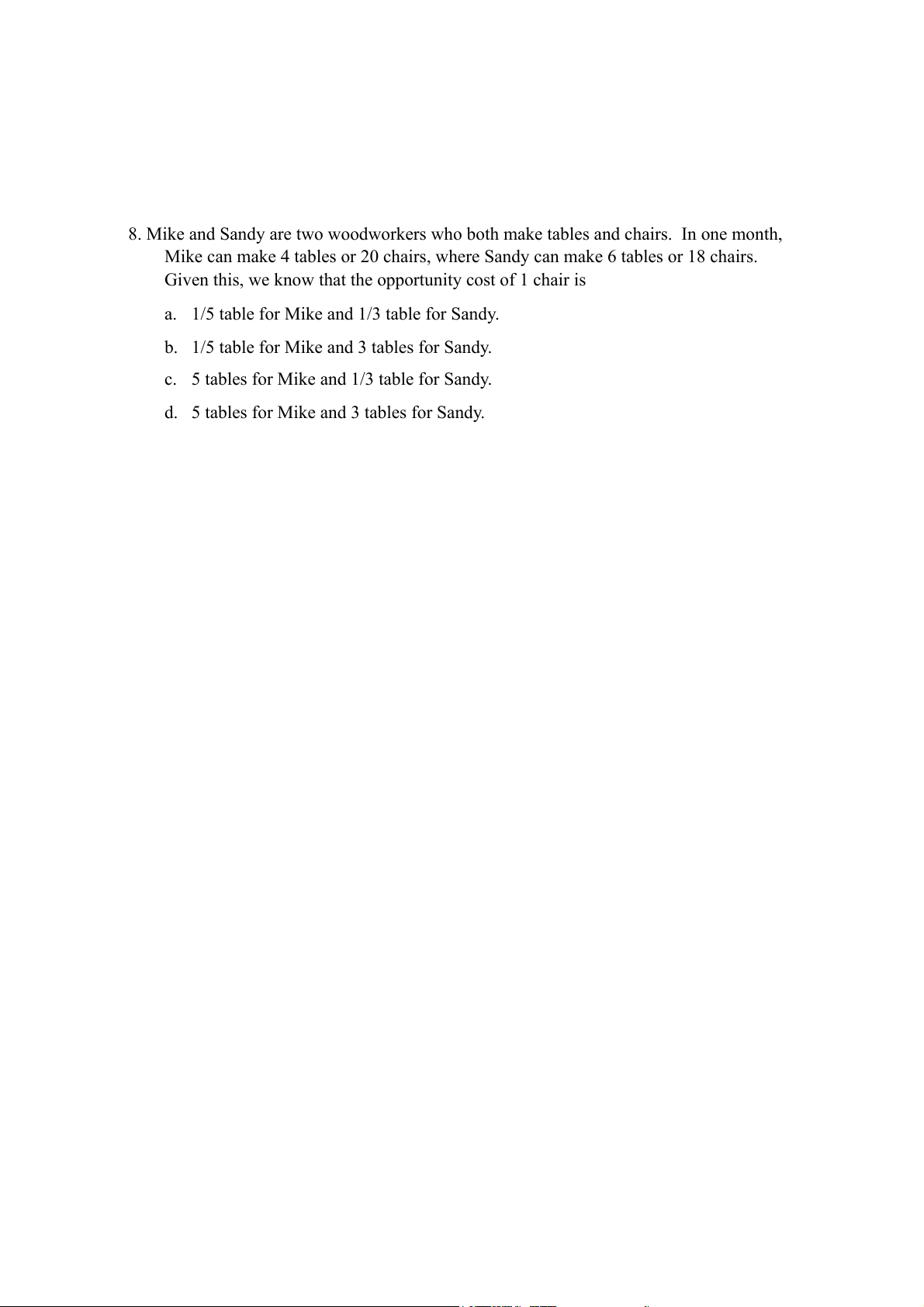 8. Mike and Sandy are two woodworkers who both make tables and chairs. In one month,