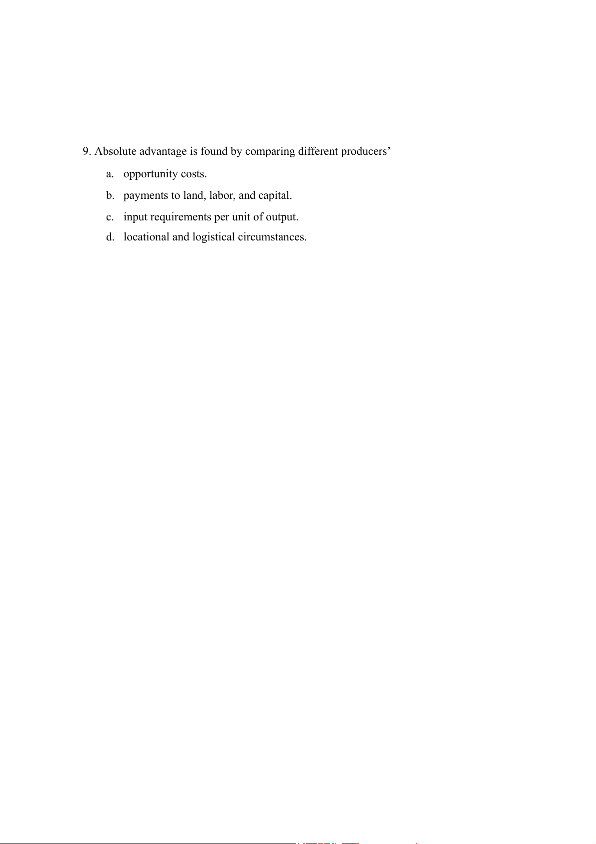 9. Absolute advantage is found by comparing different producers’ a. opportunity costs.