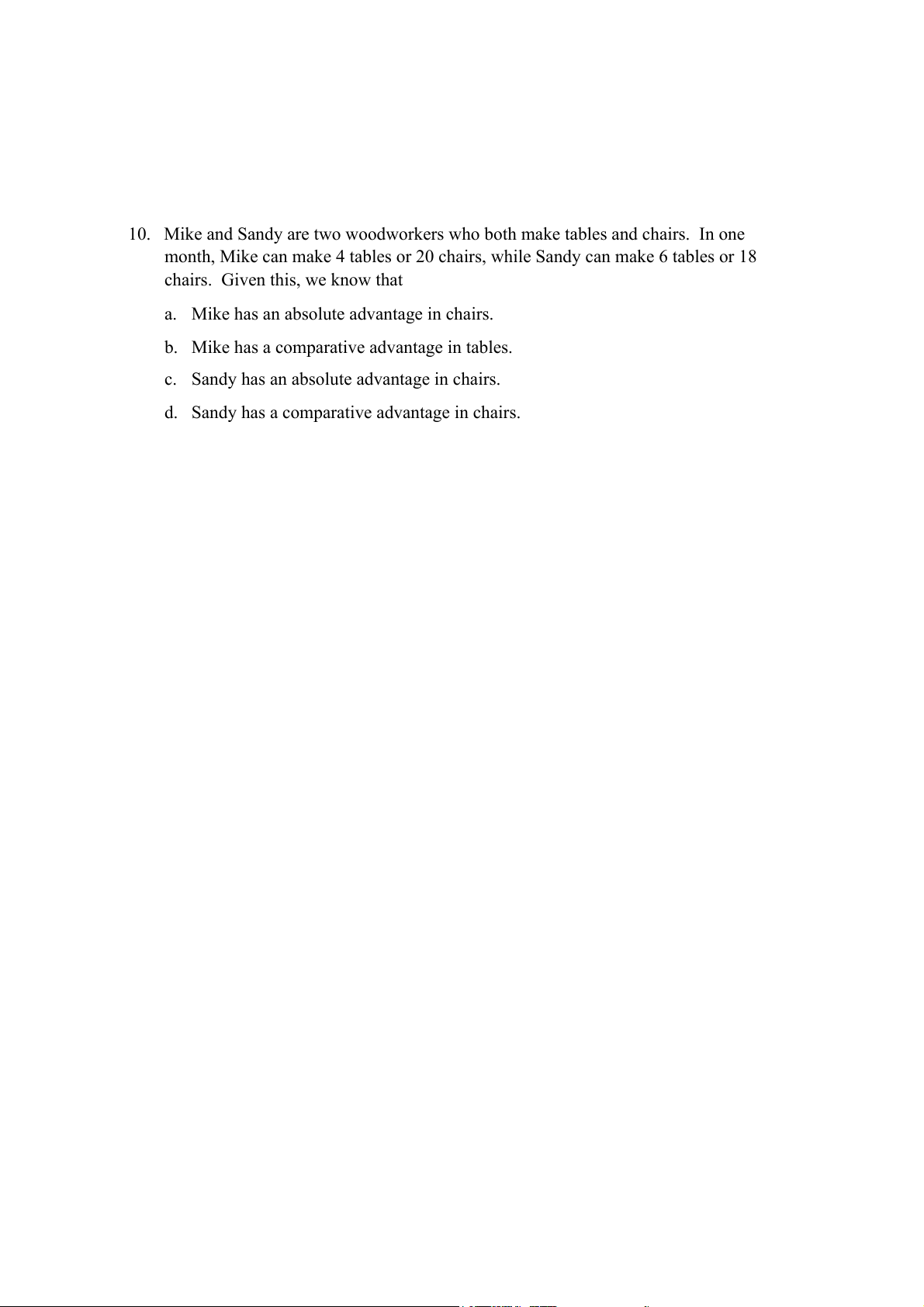 d. Sandy has a comparative advantage in chairs.