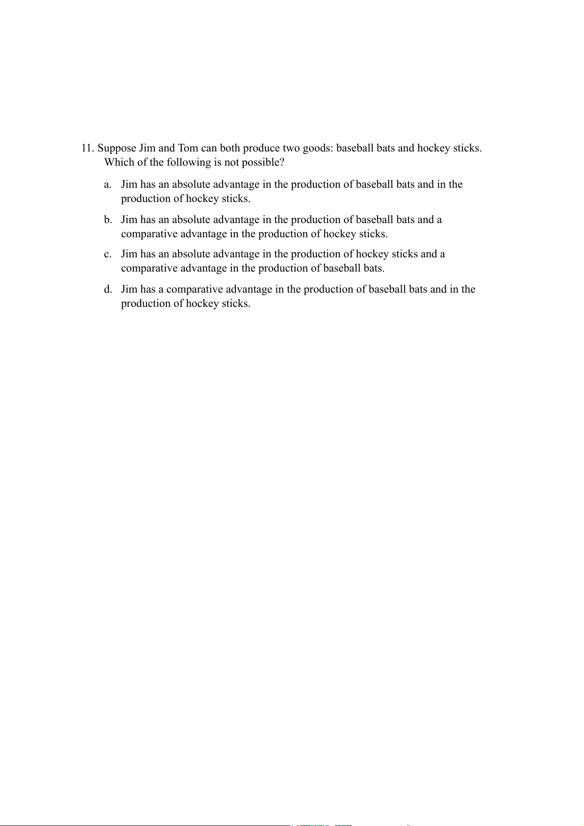 11. Suppose Jim and Tom can both produce two goods: baseball bats and hockey sticks.