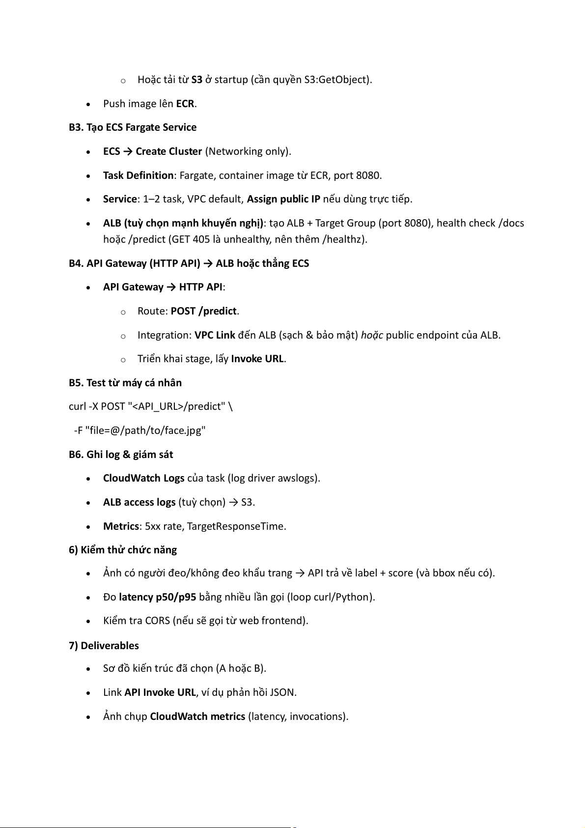 Option B (DevOps phổ thông): ECS Fargate chạy FastAPI/Flask + ALB + API Gateway (hoặc ALB trực tiếp). 1) Mục tiêu •