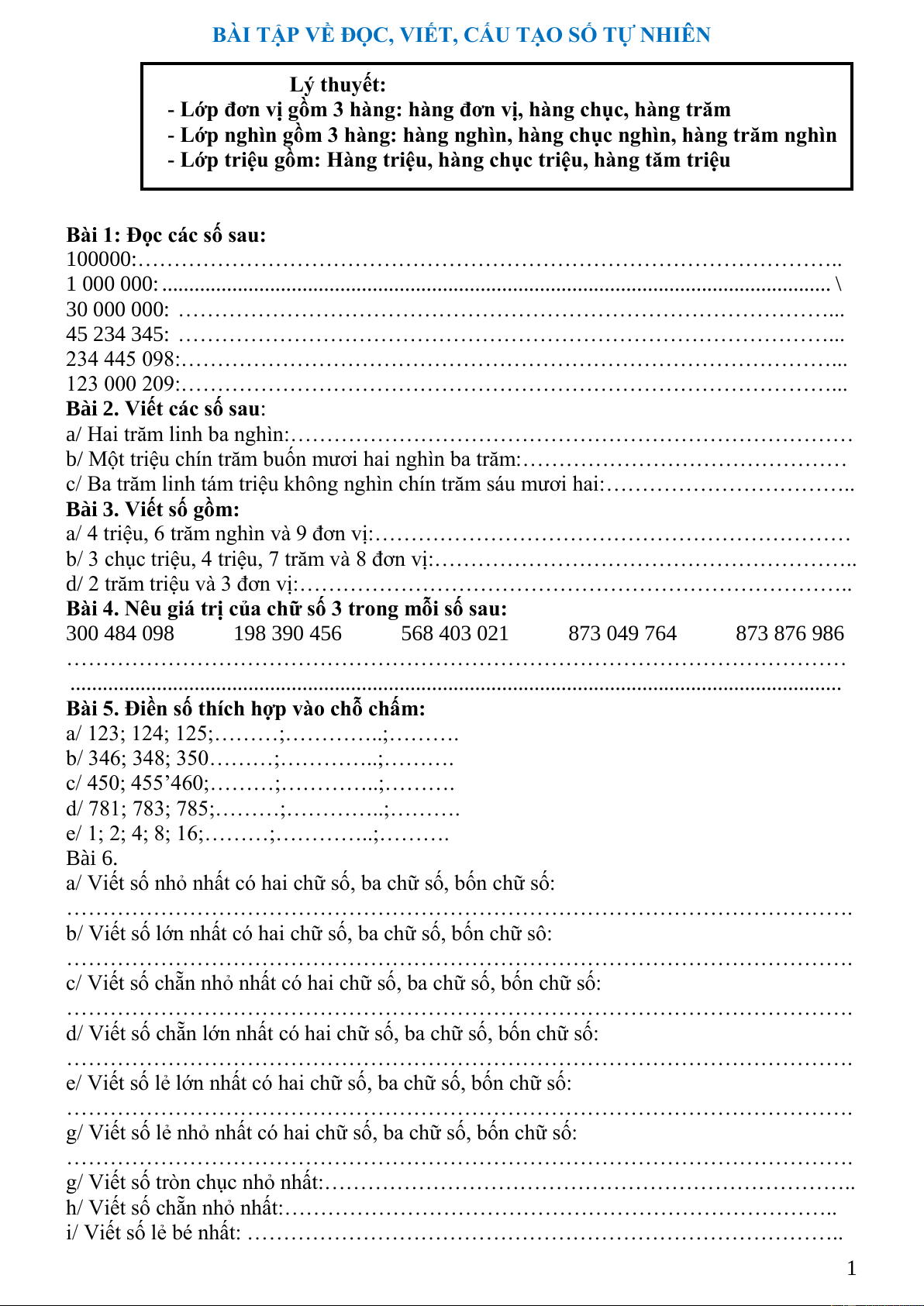BÀI TẬP VỀ ĐỌC, VIẾT, CẤU TẠO SỐ TỰ NHIÊN Lý thuyết: