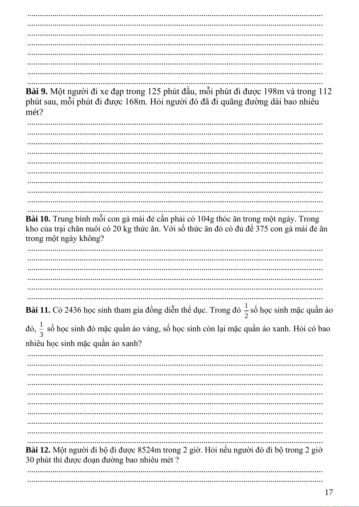 Bài 9. Một người đi xe đạp trong 125 phút đầu, mỗi phút đi được 198m và trong 112
