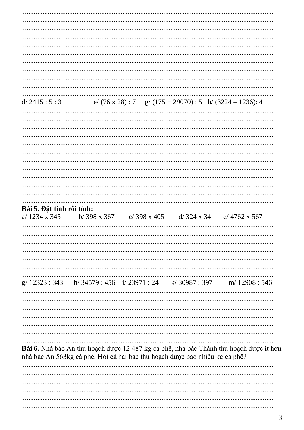 a/ 1200 kg : 5 =………….; b/ 4352 m x 23 = …………; c/ 2500 g : 4 = ……………