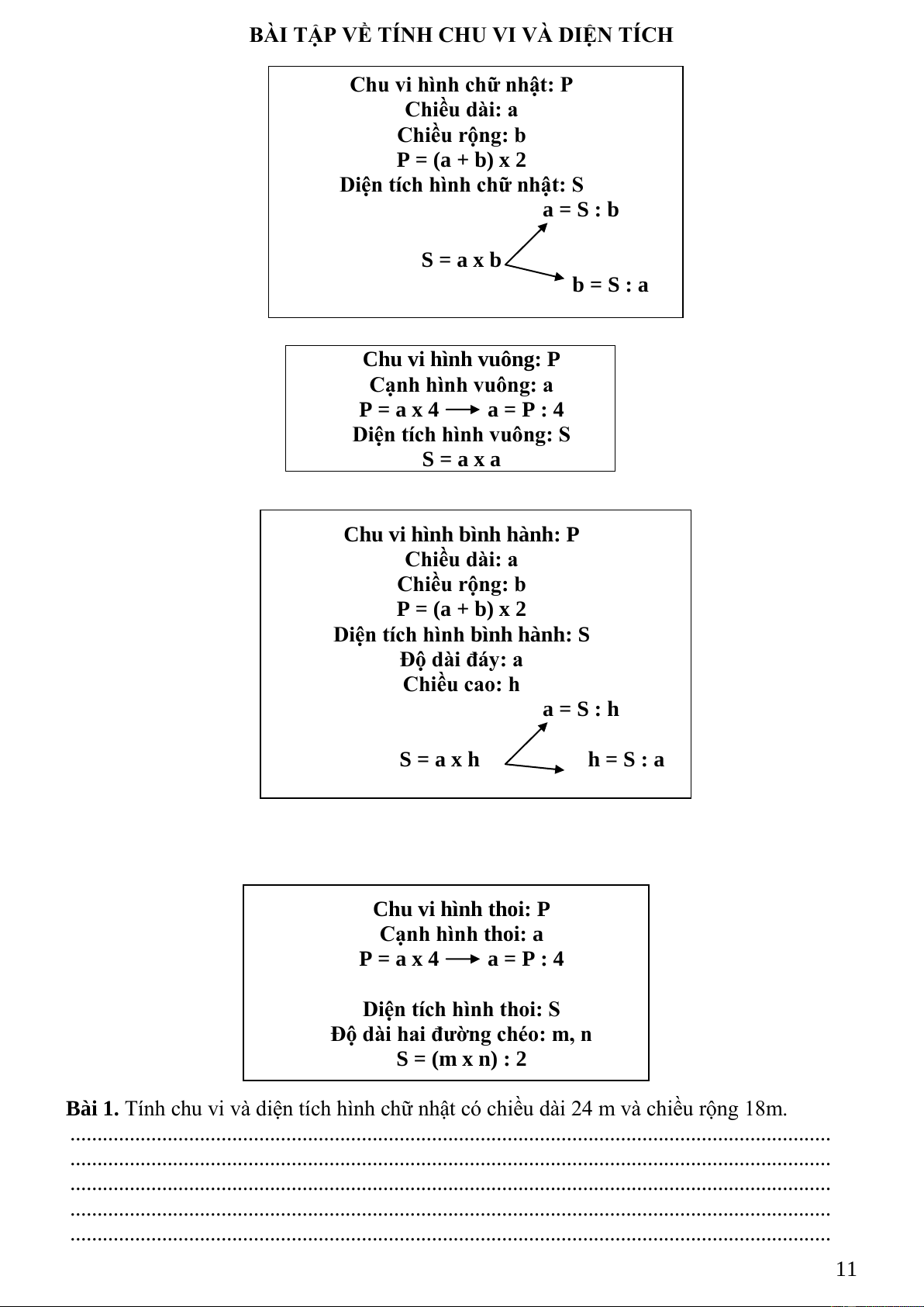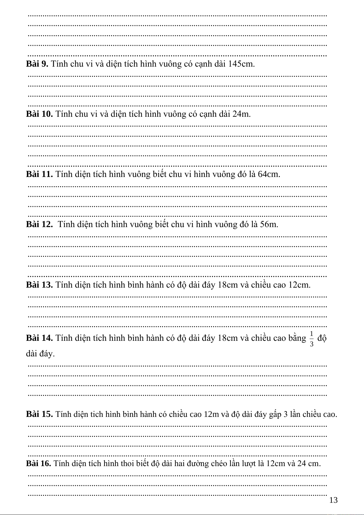 Bài 15. Tính diện tich hình bình hành có chiều cao 12m và độ dài đáy gấp 3 lần chiều cao.
