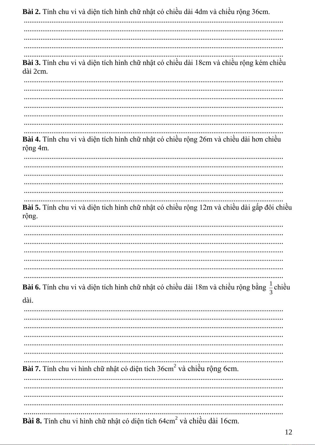 Bài 8. Tính chu vi hình chữ nhật có diện tích 64cm2 và chiều dài 16cm. 12