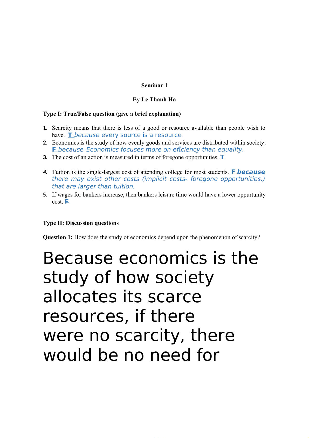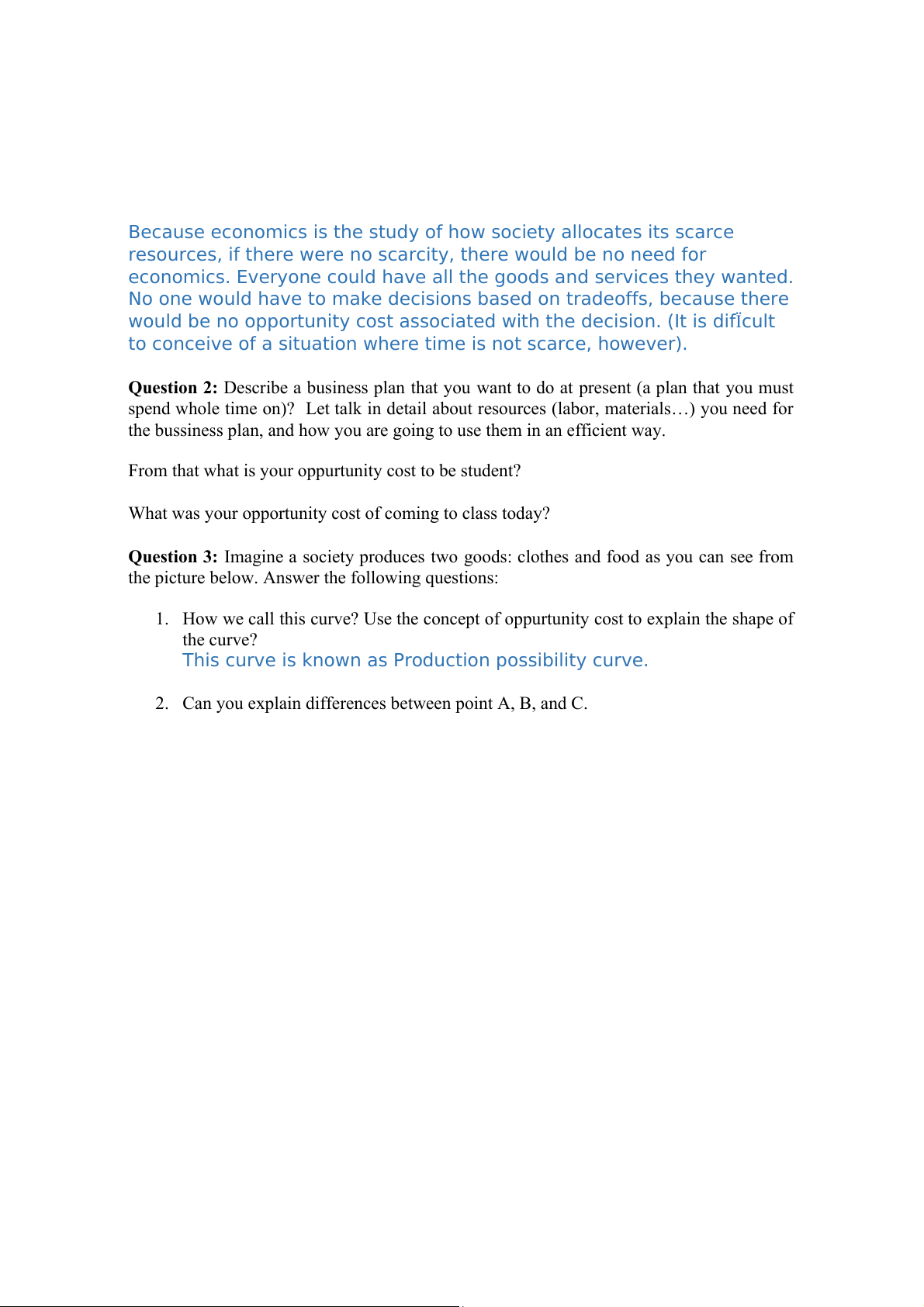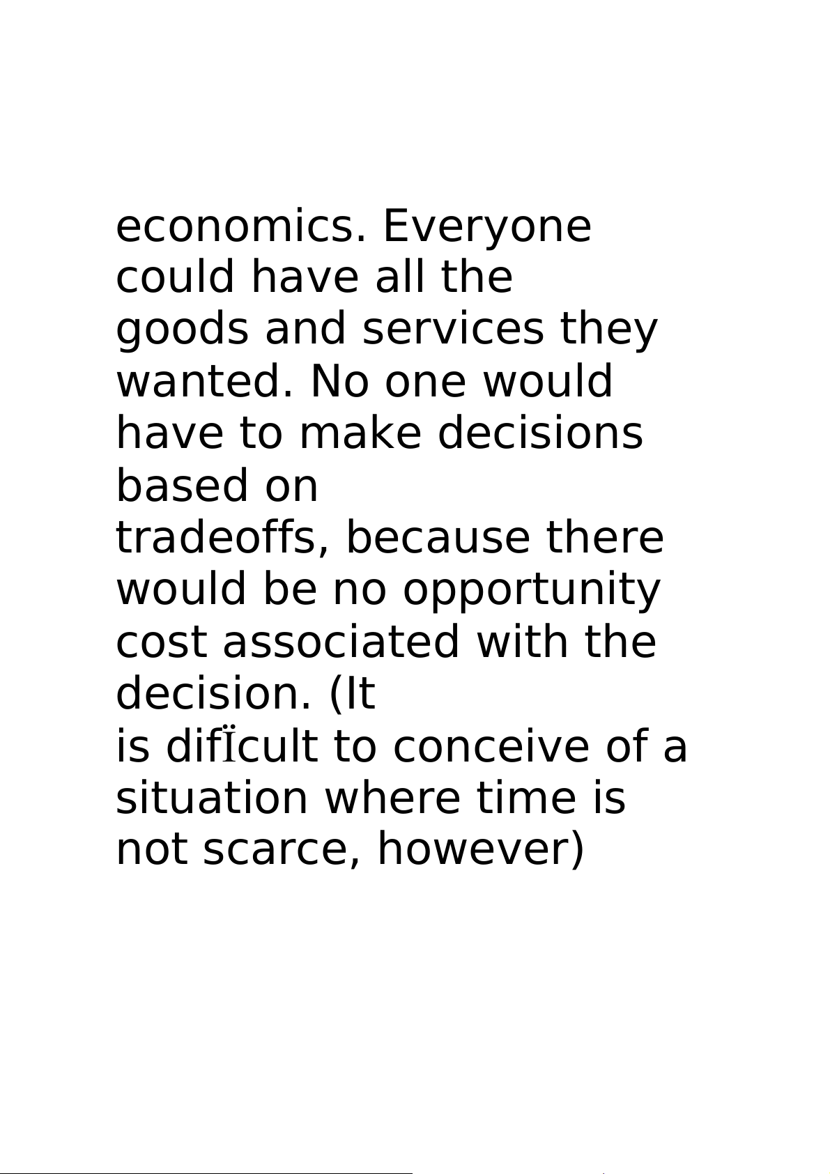 Question 1: How does the study of economics depend upon the phenomenon of scarcity? Because economics is the study of how society allocates its scarce resources, if there were no scarcity, there would be no need for economics. Everyone could have all the goods and services they wanted. No one would have to make decisions based on tradeoffs, because there would be no opportunity cost associated with the decision. (It is difÏcult to conceive of a situation where time is not scarce, however)