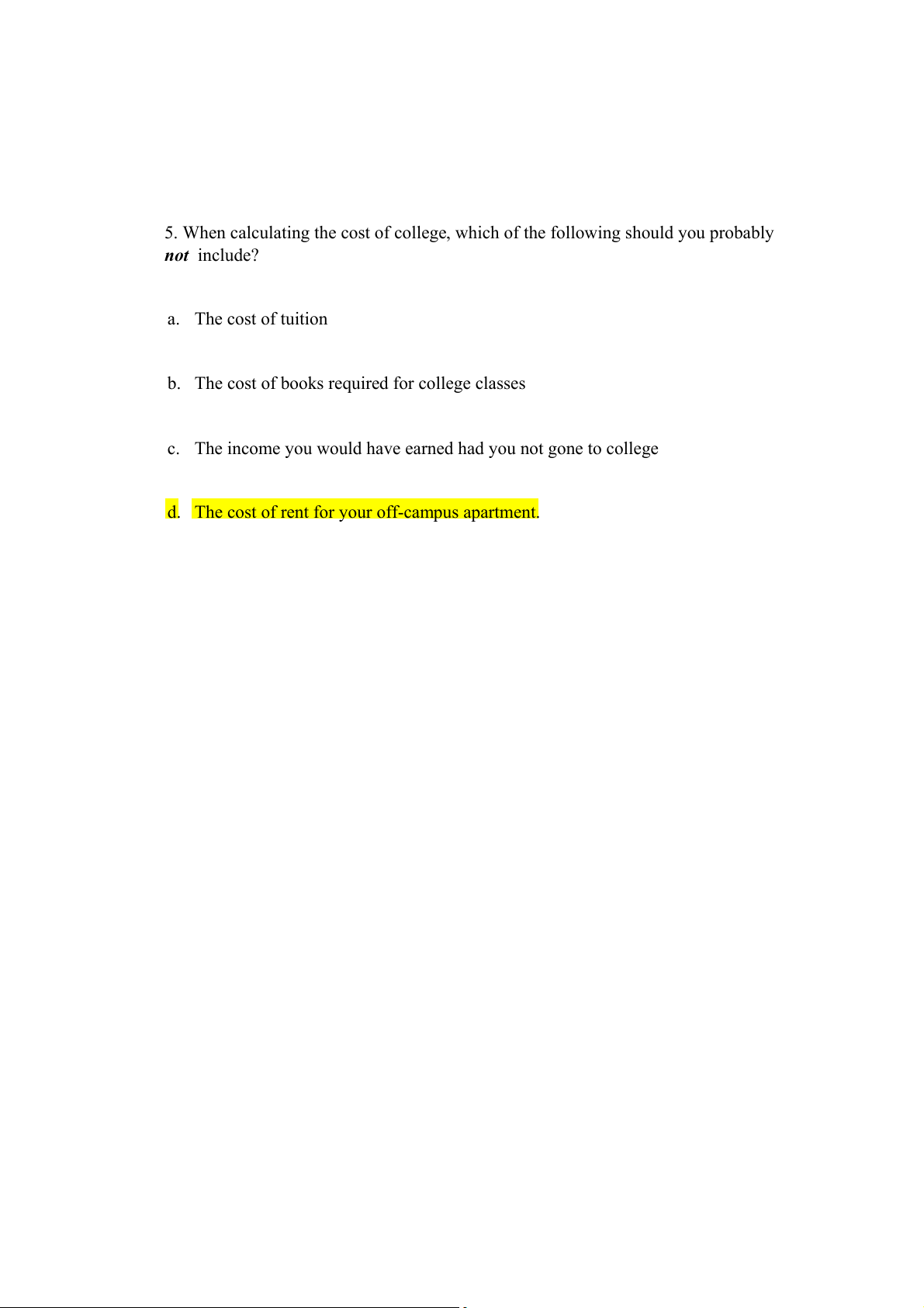 5. When calculating the cost of college, which of the following should you probably not include? a. The cost of tuition