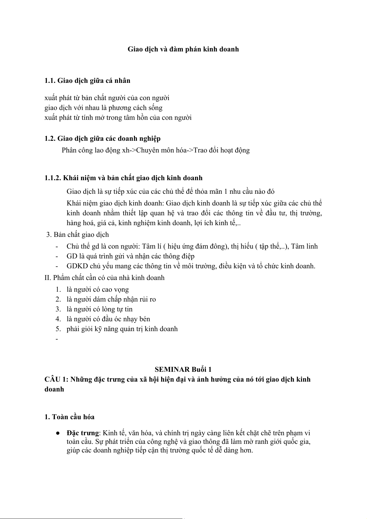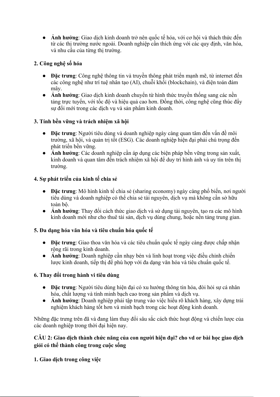 CÂU 1: Những đặc trưng của xã hội hiện đại và ảnh hưởng của nó tới giao dịch kinh doanh 1. Toàn cầu hóa
