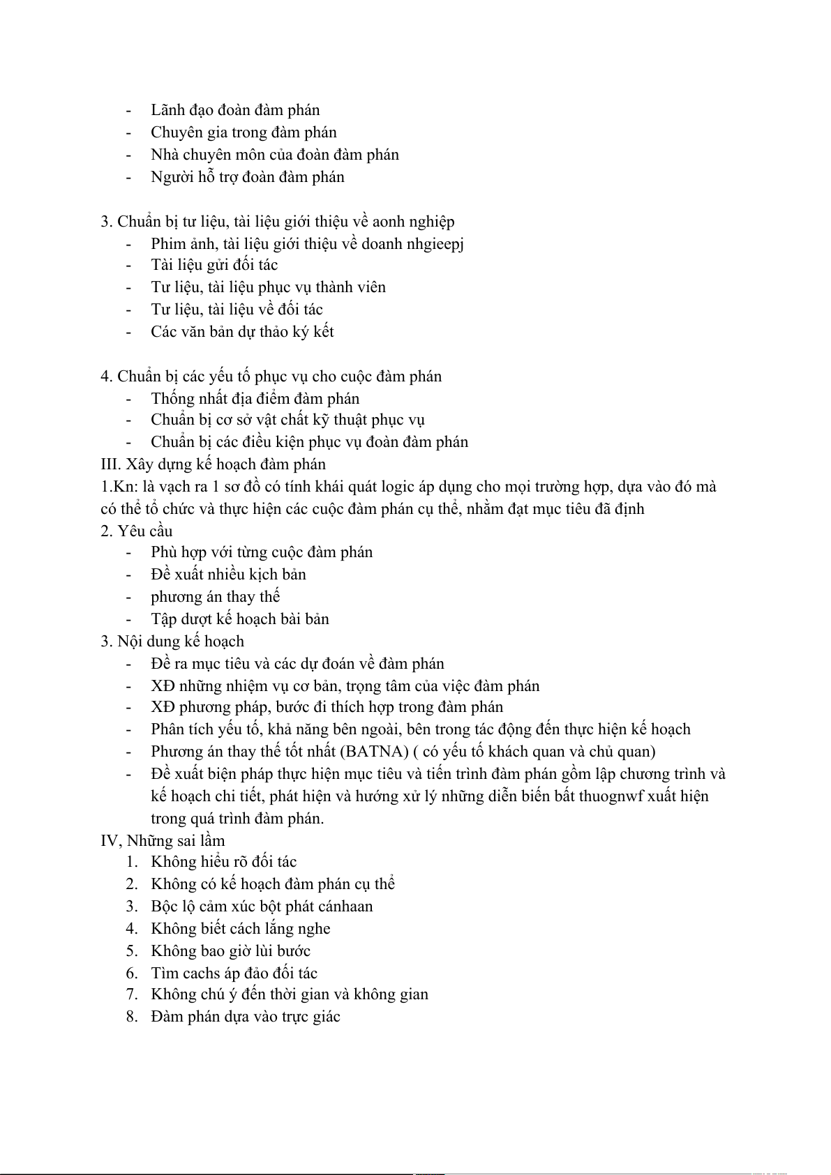 kế hoạch chi tiết, phát hiện và hướng xử lý những diễn biến bất thuognwf xuất hiện trong quá trình đàm phán. IV, Những sai lầm