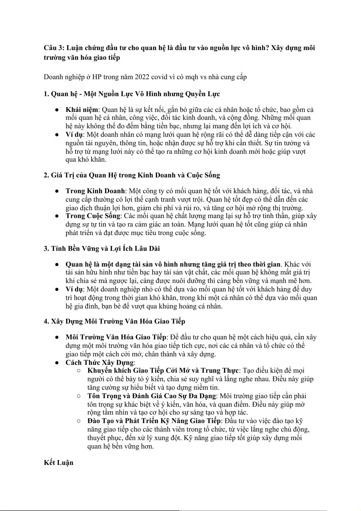 Câu 3: Luận chứng đầu tư cho quan hệ là đầu tư vào nguồn lực vô hình? Xây dựng môi