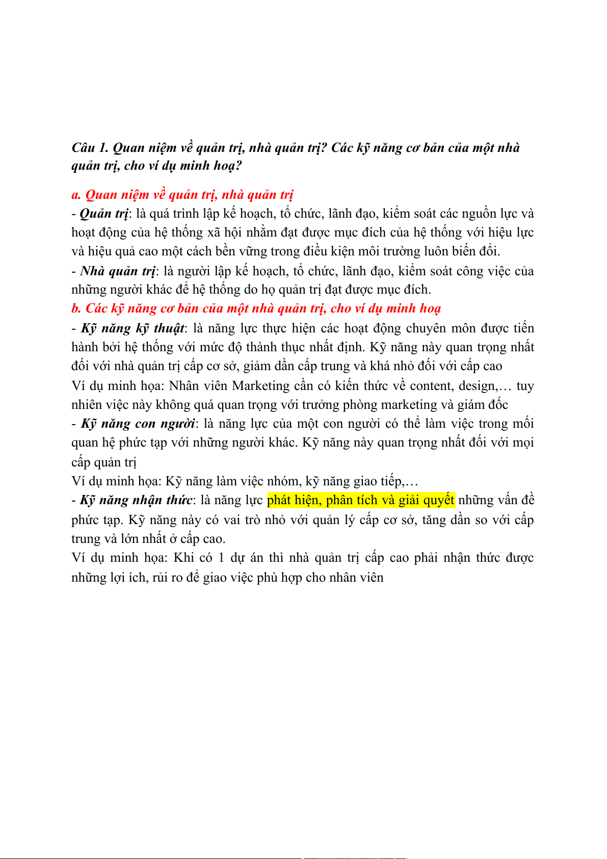 Câu 1. Quan niệm về quản trị, nhà quản trị? Các kỹ năng cơ bản của một nhà