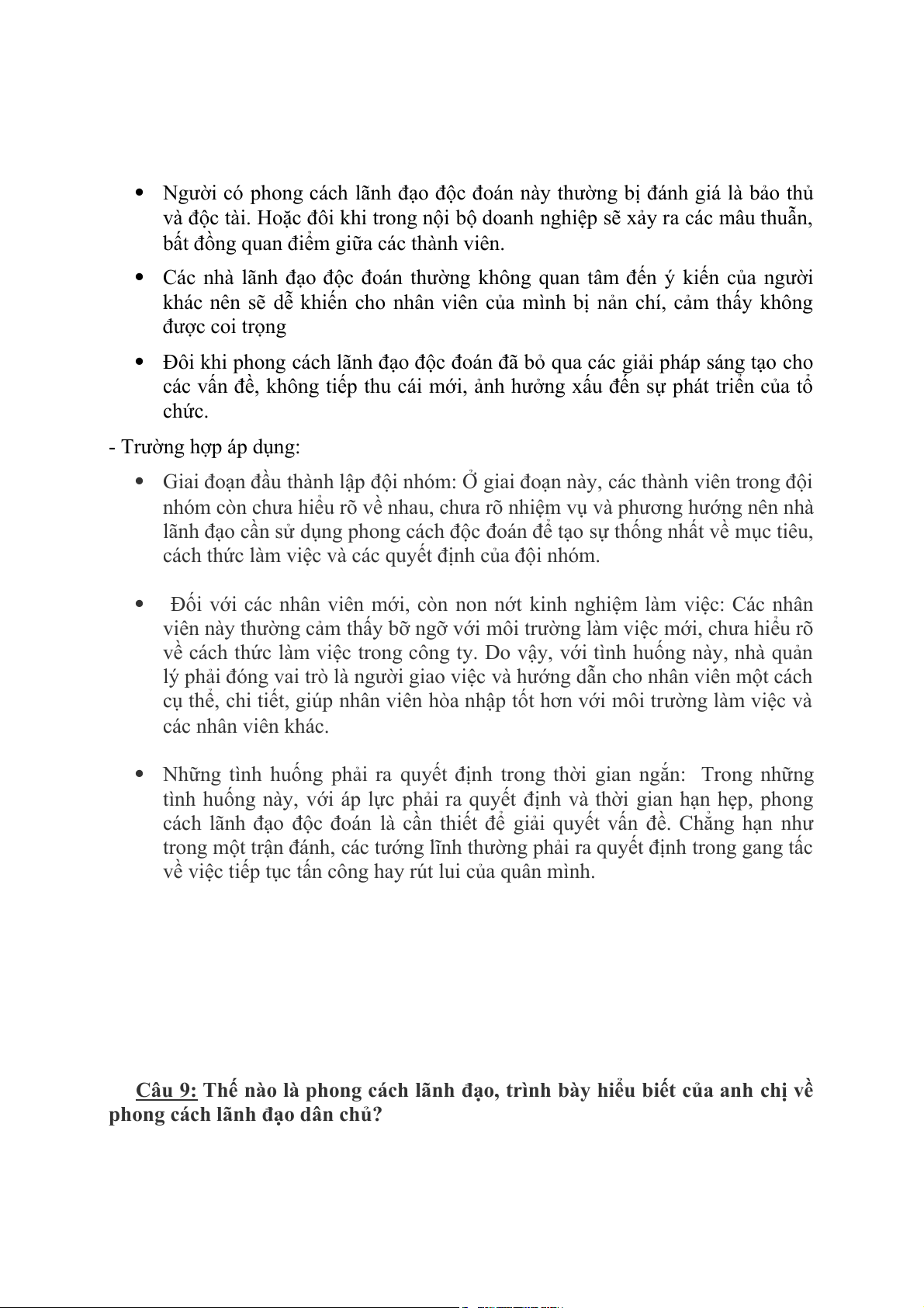 Câu 9: Thế nào là phong cách lãnh đạo, trình bày hiểu biết của anh chị về