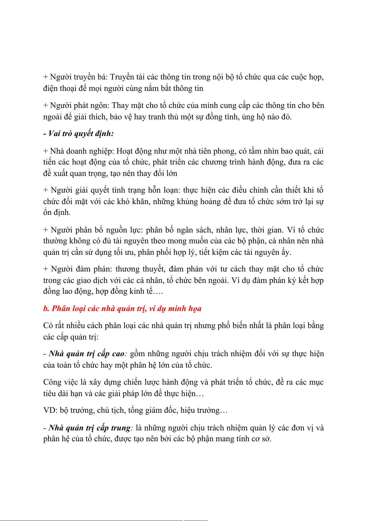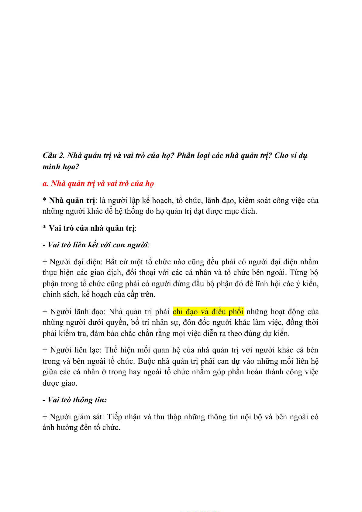 Câu 2. Nhà quản trị và vai trò của họ? Phân loại các nhà quản trị? Cho ví dụ minh họa?