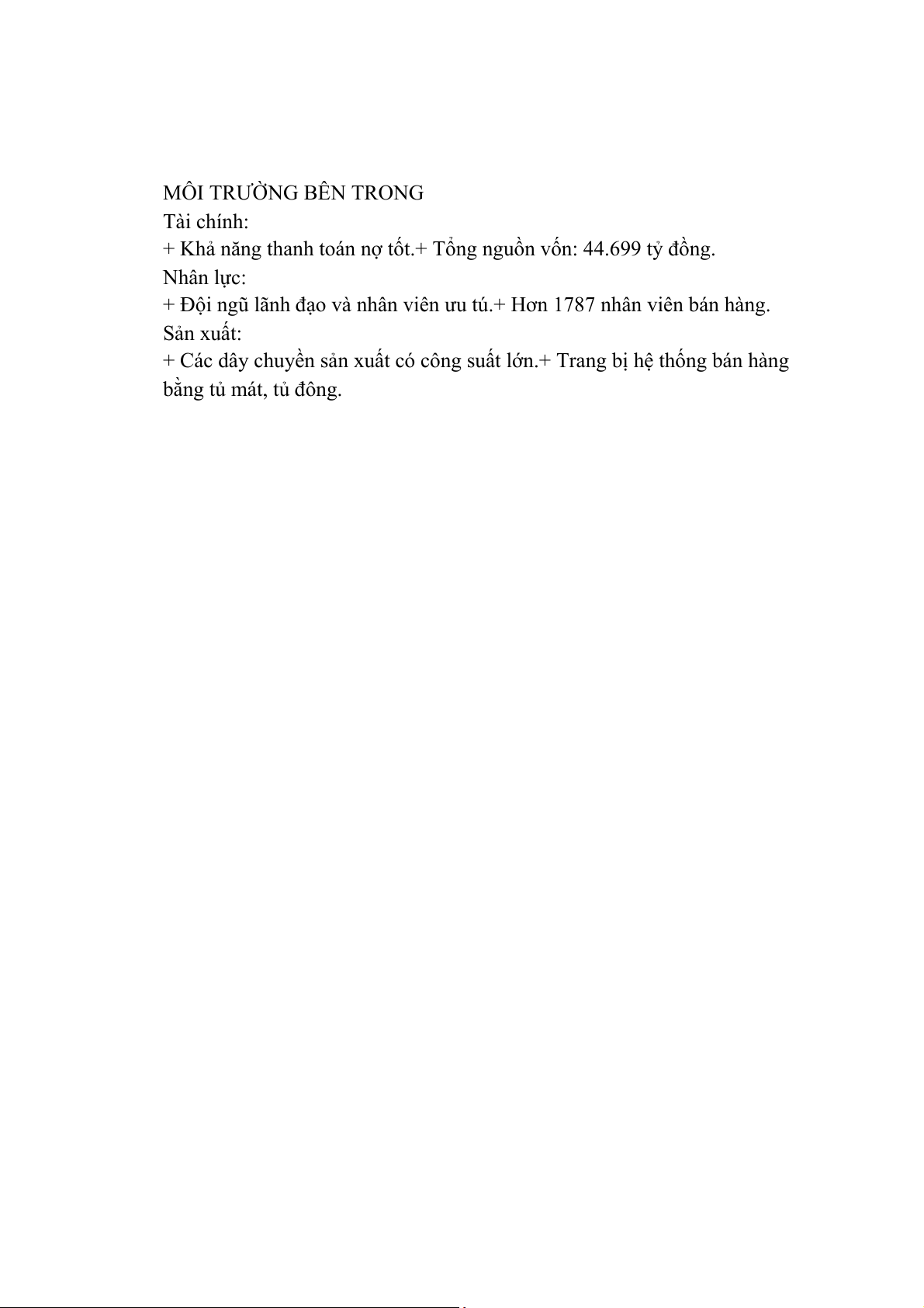 - Nhóm lợi ích đặc biệt (SIG) - Công đoàn - Nhà nước + môi trường bên trong: Tài chính Marketing Nguồn nhân Sản Nghiên cứu Cơ cấu tổ Các chiến lực xuất và ptrien chức lược hiện thời Khả năng Sản phẩm/ Phân tích Cv Thiết bị Nhu cầu Tính hợp lí Đánh giá thanh toán dịch vụ R&D định tính Khả năng tạo Giá cả Phát triển Tồn Phương tiện Khả năng Đánh gía ra GTGT NNL kho và thiết bị giải trình định lượng Cơ cấu vốn Phân phối
