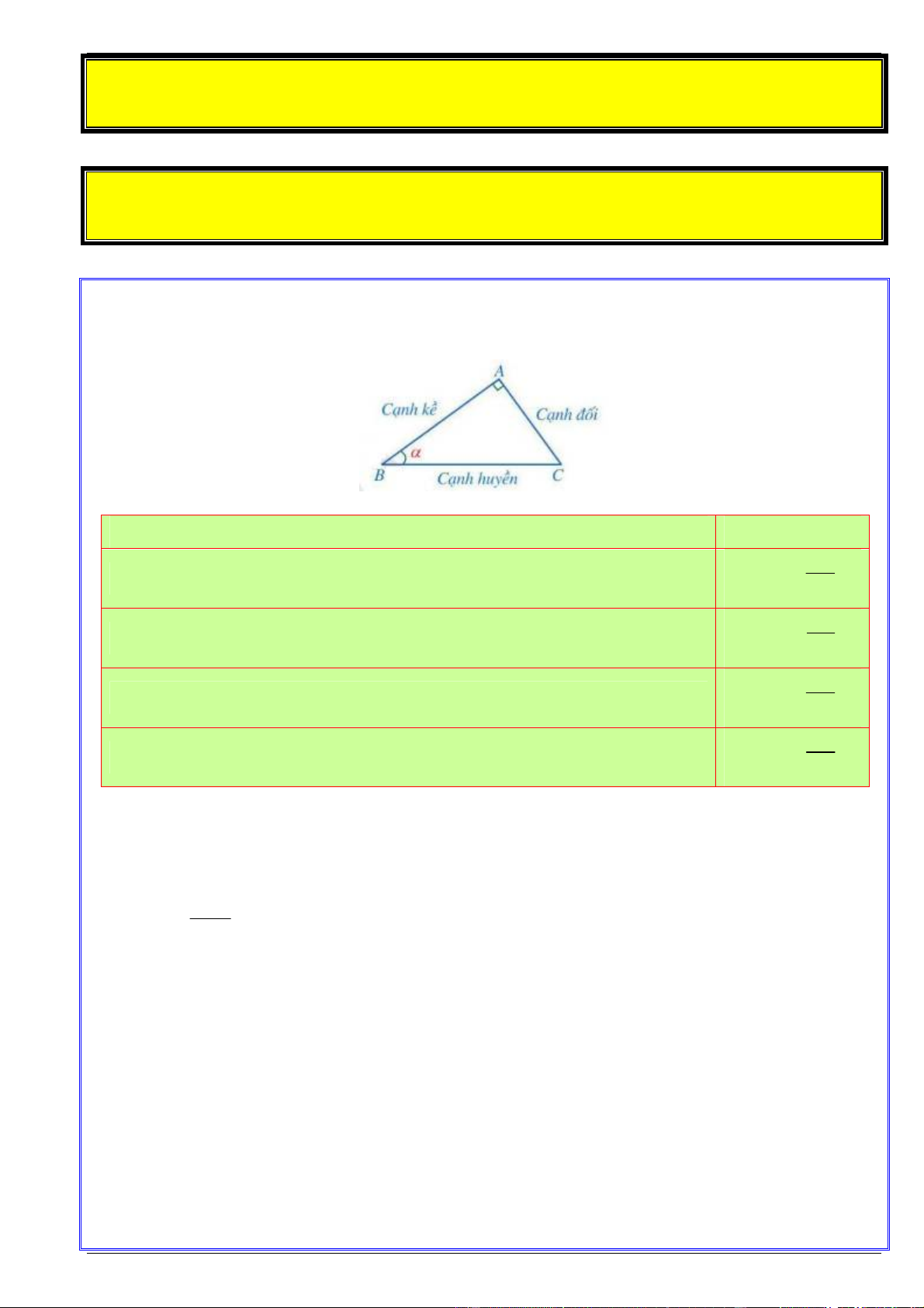 Xét ABC vuông tại A có ABC . Ta có tỉ số lượng giác của góc như sau: AC AB AC BC sin cos tan cot BC BC BC AC