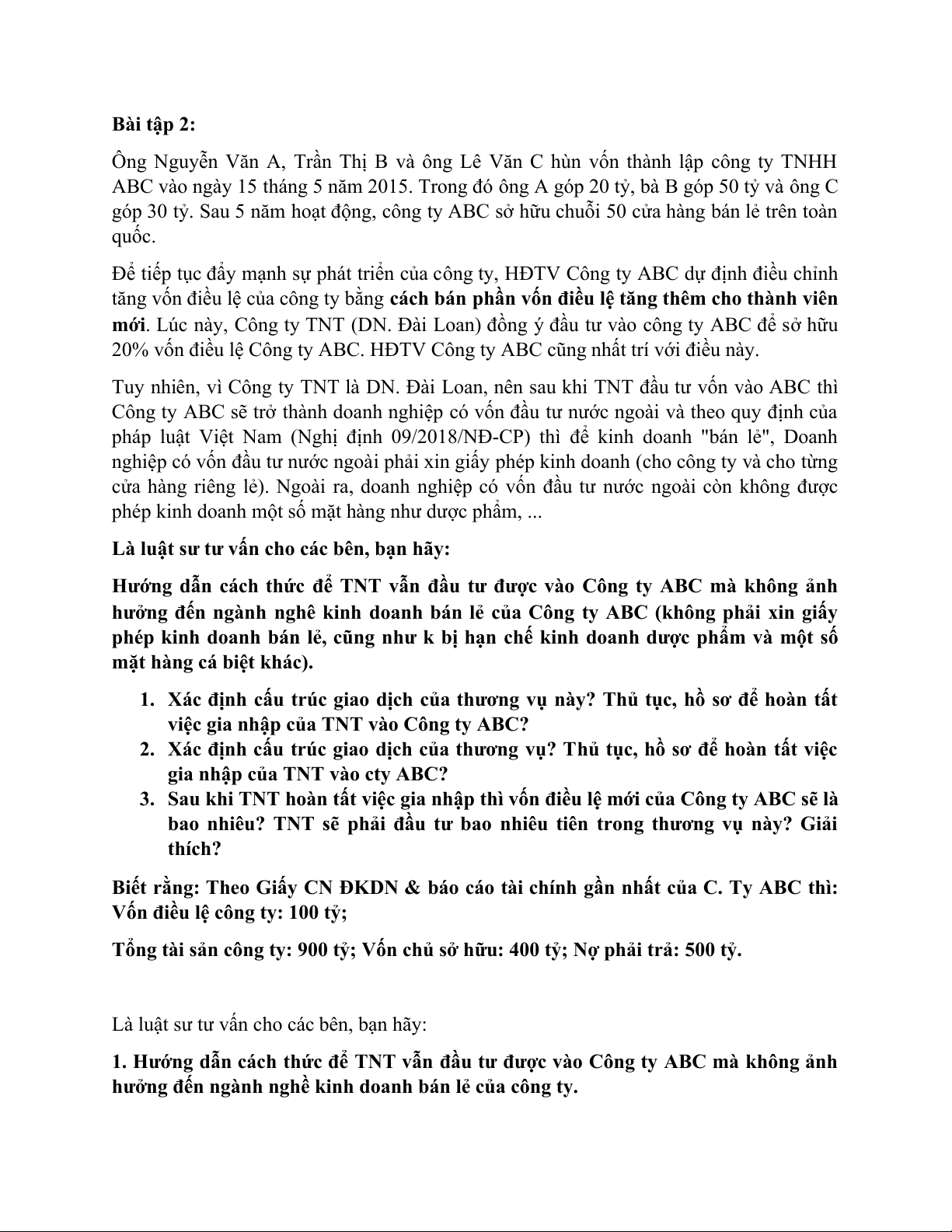 3. Sau khi TNT hoàn tất việc gia nhập thì vốn điều lệ mới của Công ty ABC sẽ là