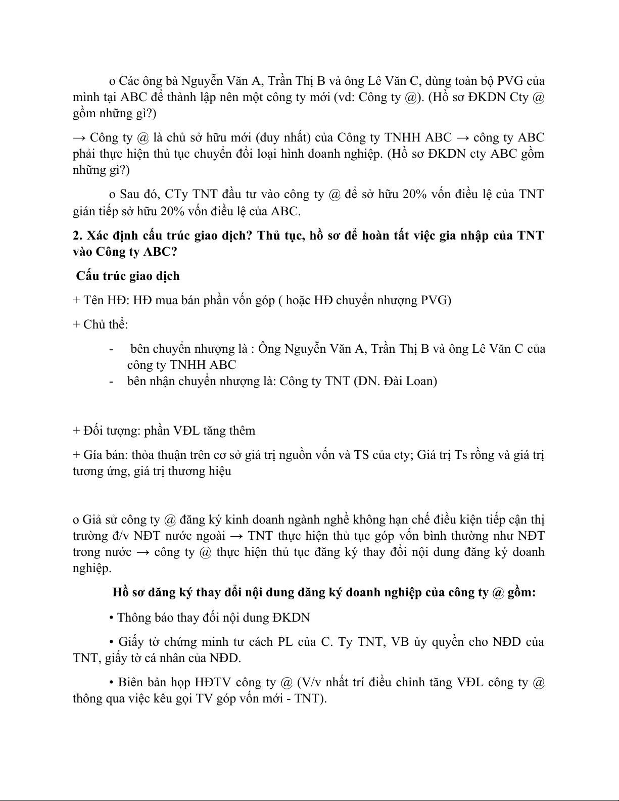 2. Xác định cấu trúc giao dịch? Thủ tục, hồ sơ để hoàn tất việc gia nhập của TNT vào Công ty ABC?