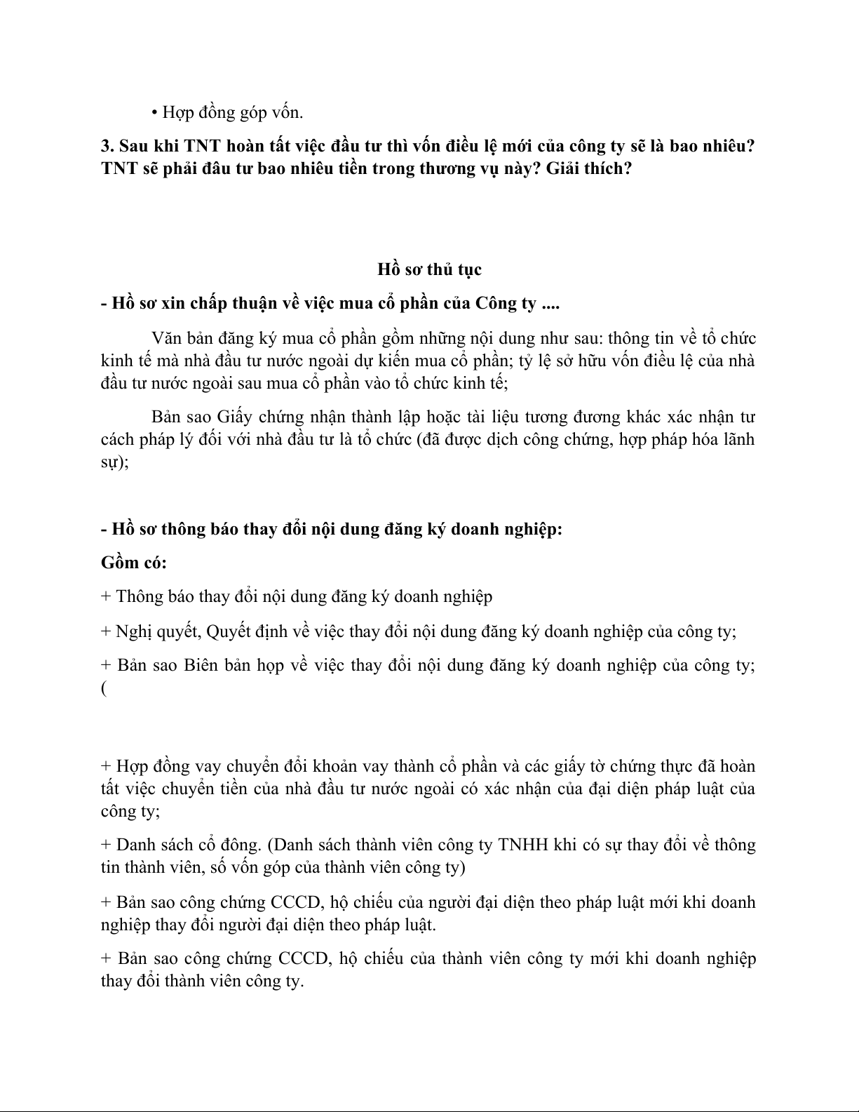 TNT sẽ phải đâu tư bao nhiêu tiền trong thương vụ này? Giải thích? Hồ sơ thủ tục