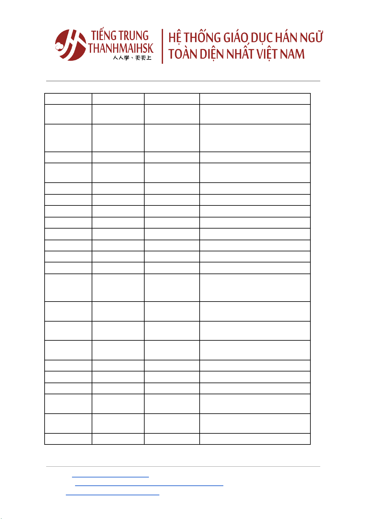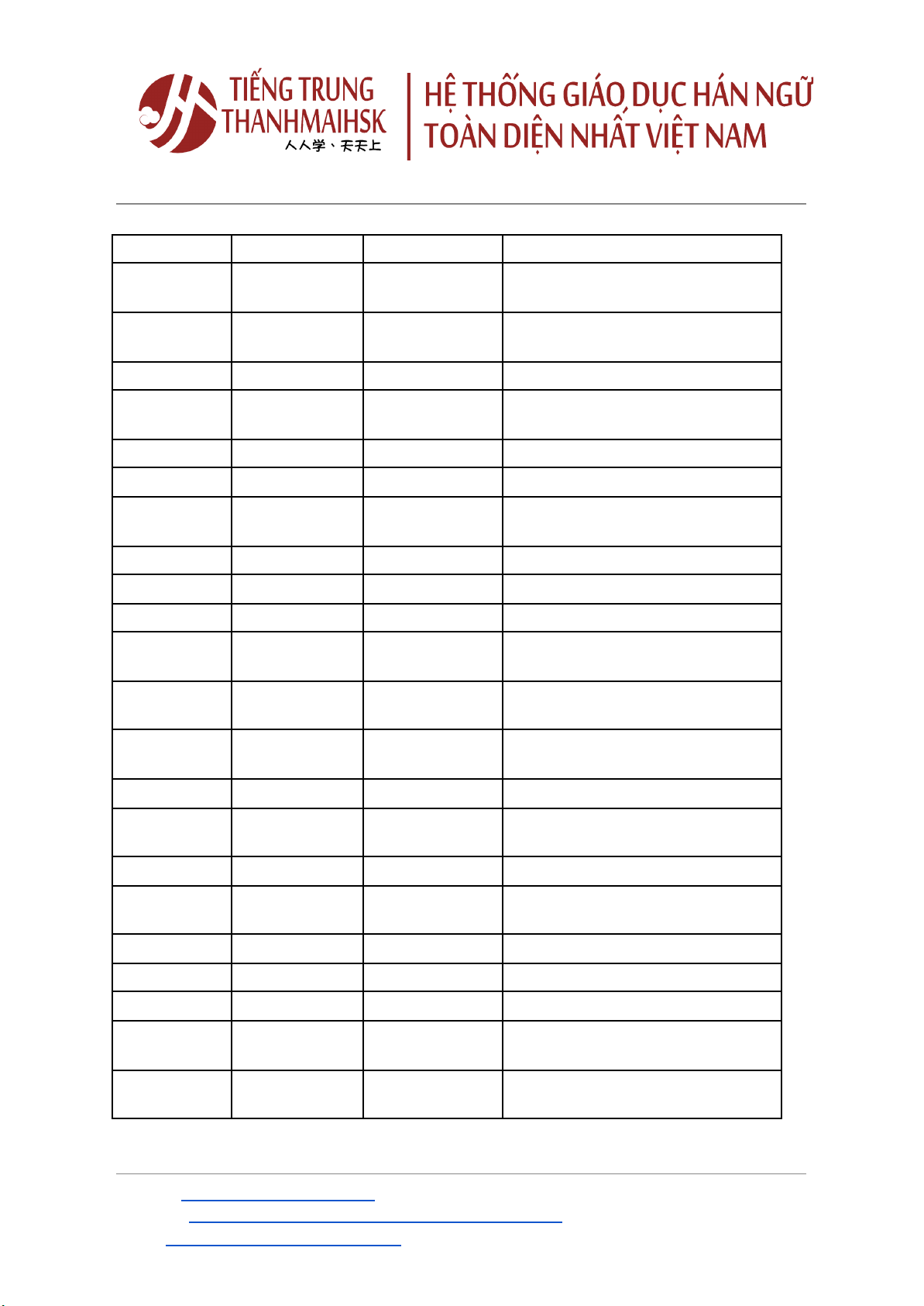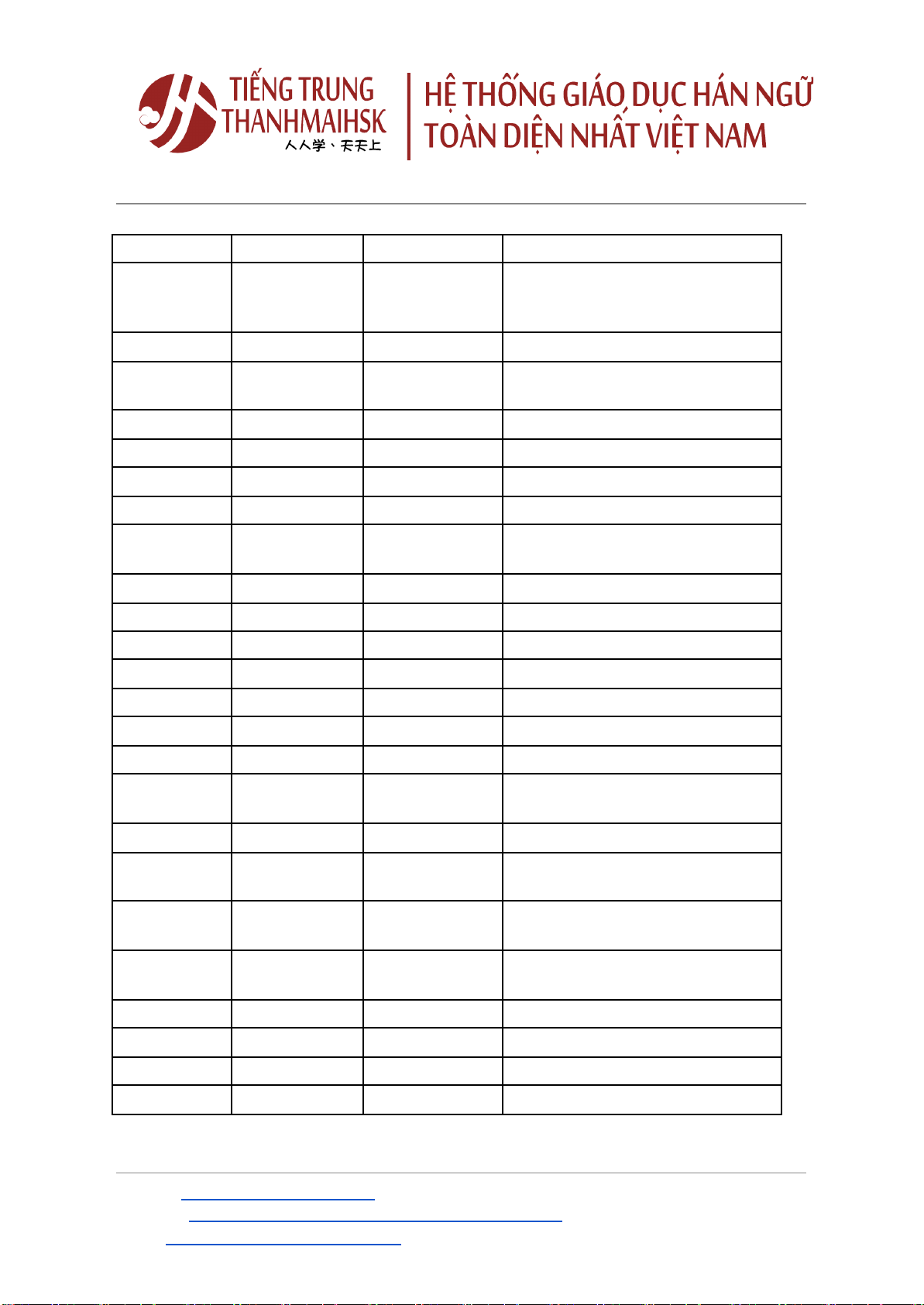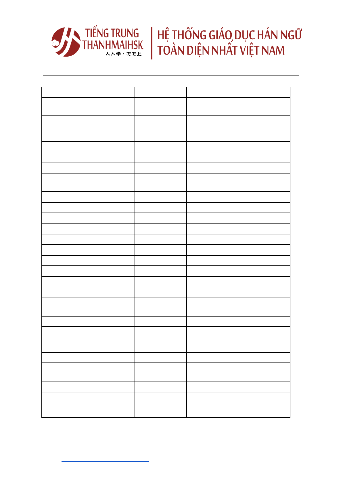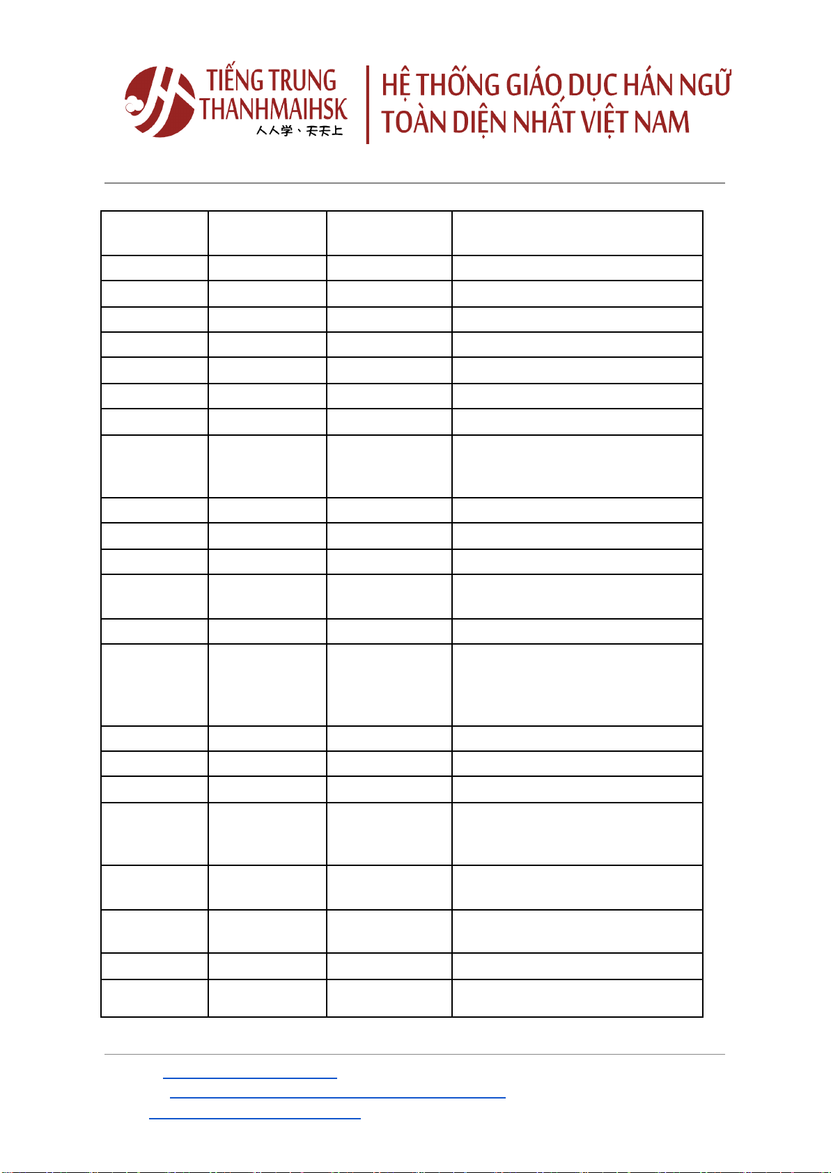 Tiktok: www.tiktok.com/@thanhmaihsk 报名 Báo danh bàomíng Động từ Báo tên Danh từ Lần 倍 bèi Lượng từ Bội Vốn dĩ, ban đầu 本来 běnlái Từ nối Có lẽ, lẽ ra, đáng lẽ 笨 bèn Tính từ Ngốc nghếch 笔记本 bǐjìběn Danh từ Sổ tay 毕业 Danh từ bìyè Tốt nghiệp Động từ 遍 biàn Lượng từ Đoạn 标准 biāozhǔn Danh từ Tiêu chuẩn Biểu đạt 表达 biǎodá Động từ Bày tỏ 表格 biǎogé Danh từ Bảng, biểu Biểu dương 表扬 biǎoyáng Động từ Tán/ tuyên dương 饼干 bǐnggān Danh từ Bánh quy Từ nối 并且 bìngqiě Hơn nữa Liên từ 博士 bóshì Danh từ Tiến sĩ bù dàn Từ nối 不但 Không những n Liên từ Từ nối