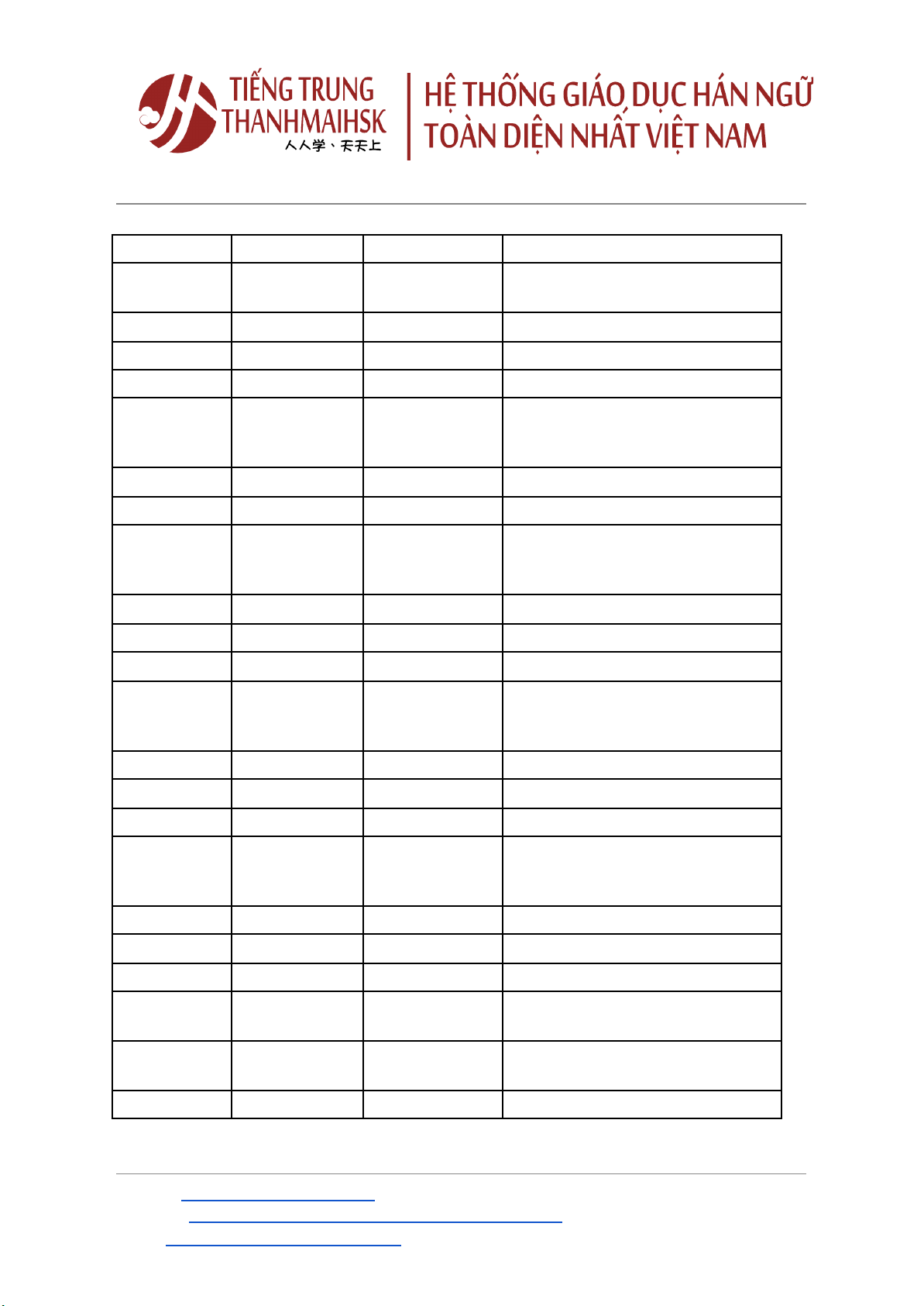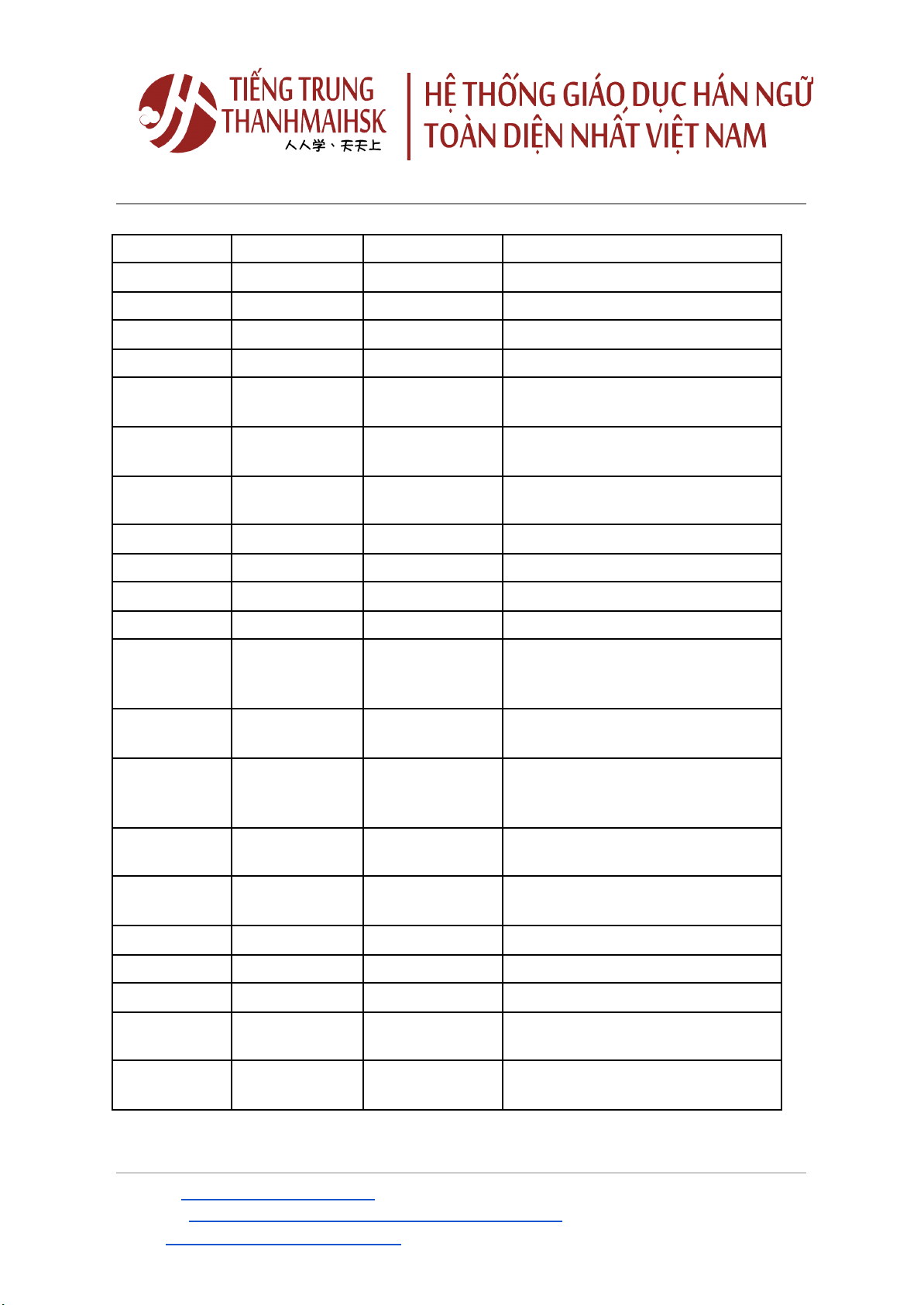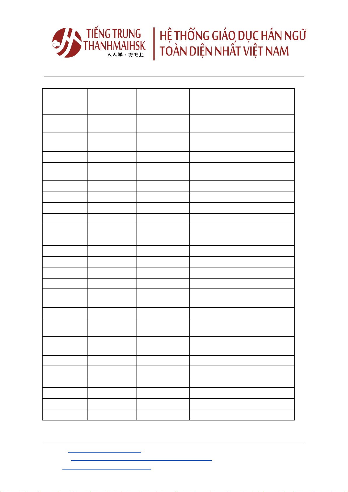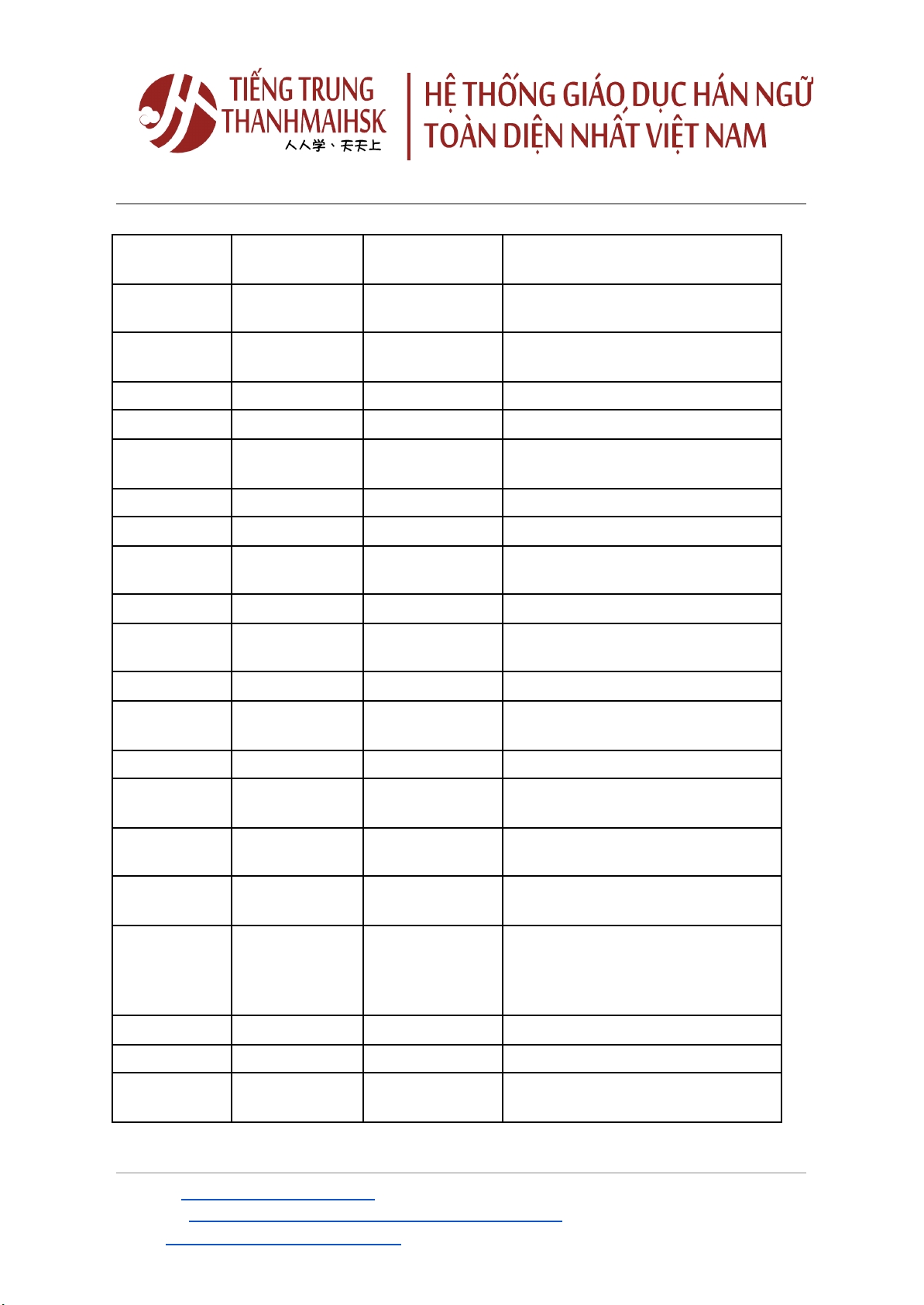 Tiktok: www.tiktok.com/@thanhmaihsk 报名 Báo danh bàomíng Động từ Báo tên Danh từ Lần 倍 bèi Lượng từ Bội Vốn dĩ, ban đầu 本来 běnlái Từ nối Có lẽ, lẽ ra, đáng lẽ 笨 bèn Tính từ Ngốc nghếch 笔记本 bǐjìběn Danh từ Sổ tay 毕业 Danh từ bìyè Tốt nghiệp Động từ 遍 biàn Lượng từ Đoạn 标准 biāozhǔn Danh từ Tiêu chuẩn Biểu đạt 表达 biǎodá Động từ Bày tỏ 表格 biǎogé Danh từ Bảng, biểu Biểu dương 表扬 biǎoyáng Động từ Tán/ tuyên dương 饼干 bǐnggān Danh từ Bánh quy Từ nối 并且 bìngqiě Hơn nữa Liên từ 博士 bóshì Danh từ Tiến sĩ bù dàn Từ nối 不但 Không những n Liên từ Từ nối