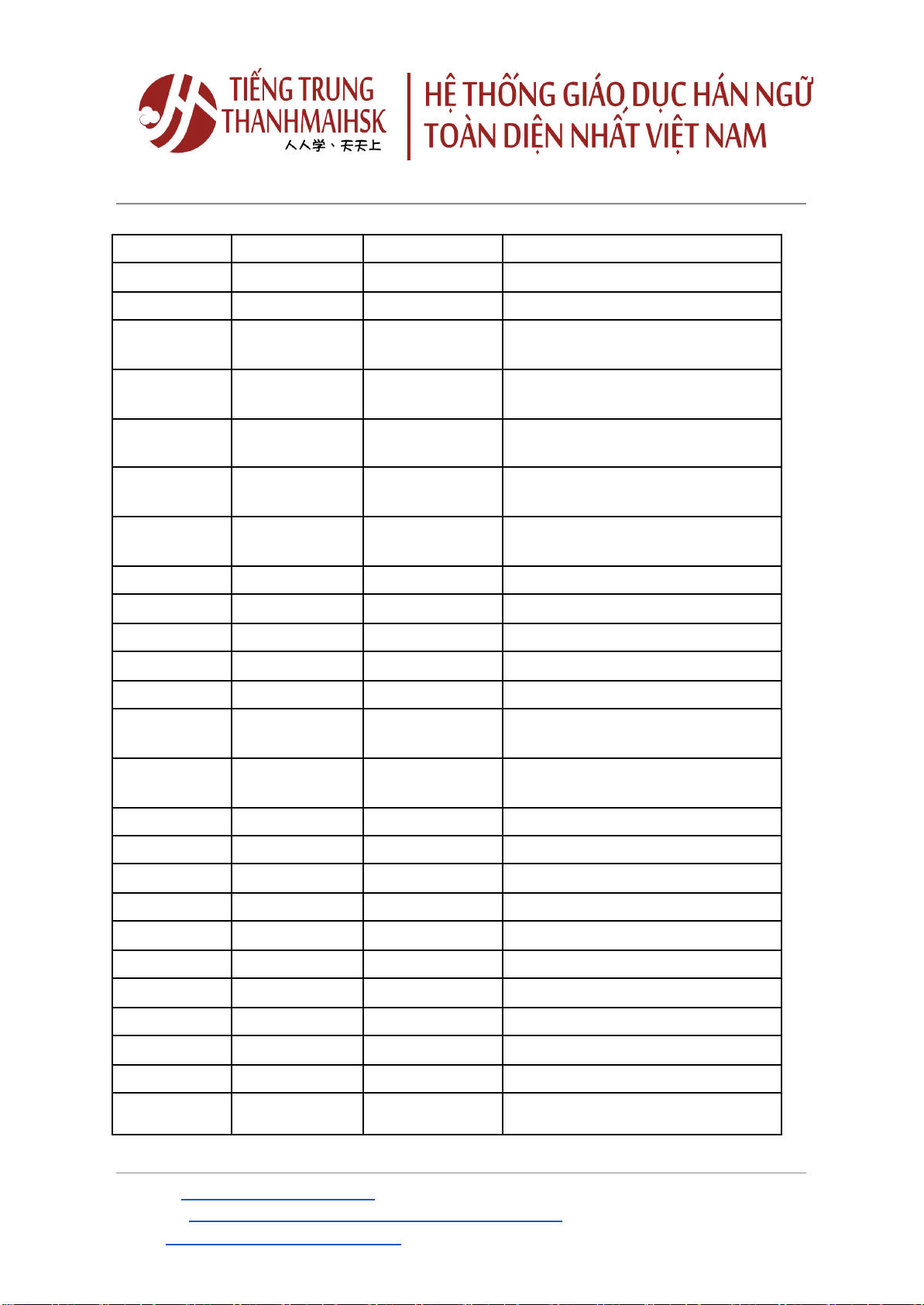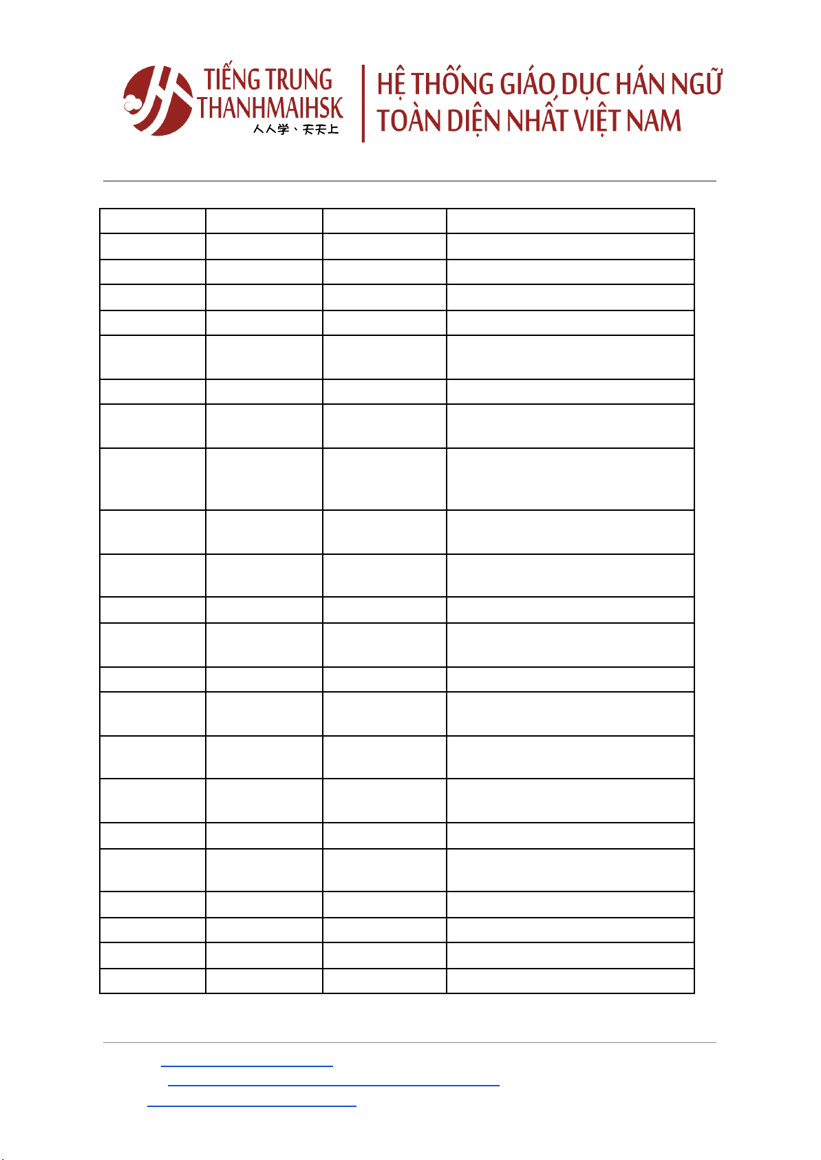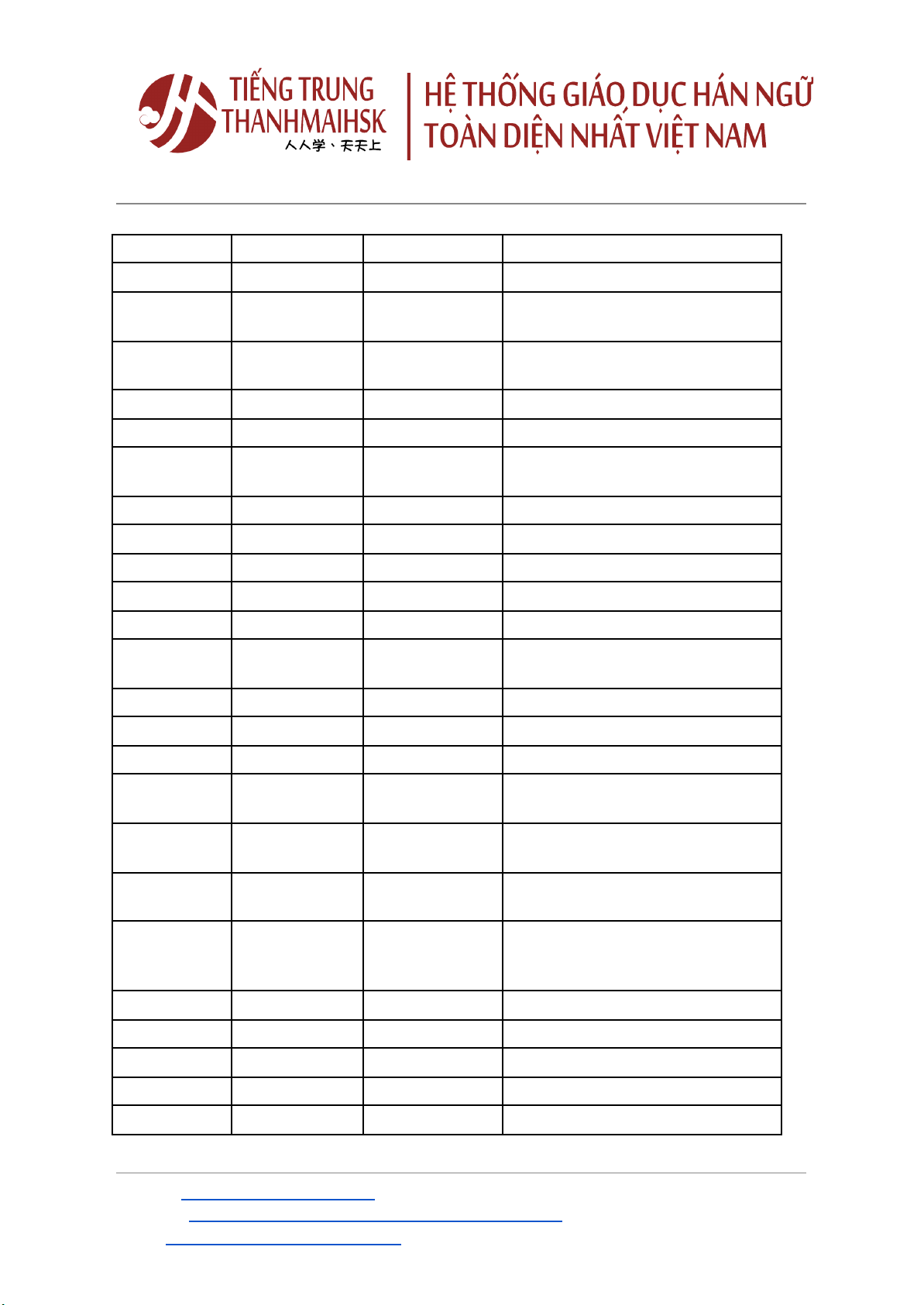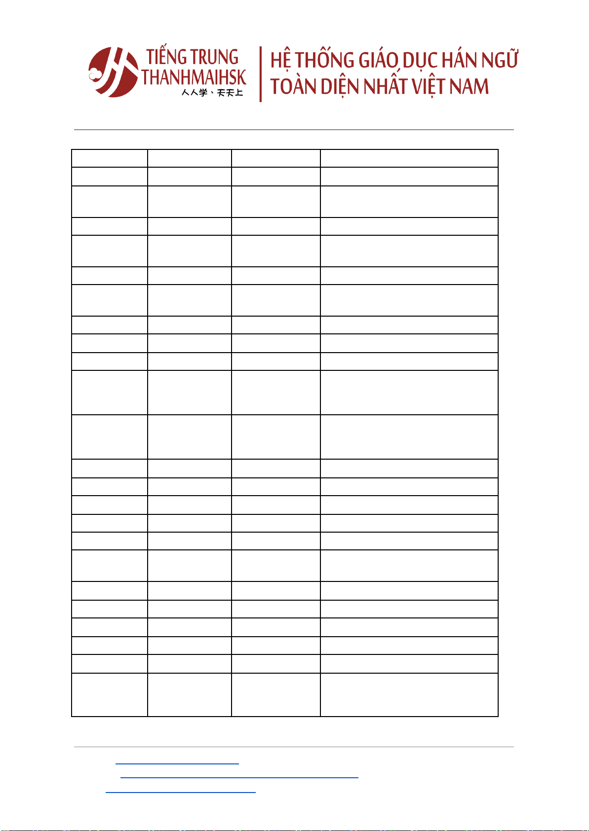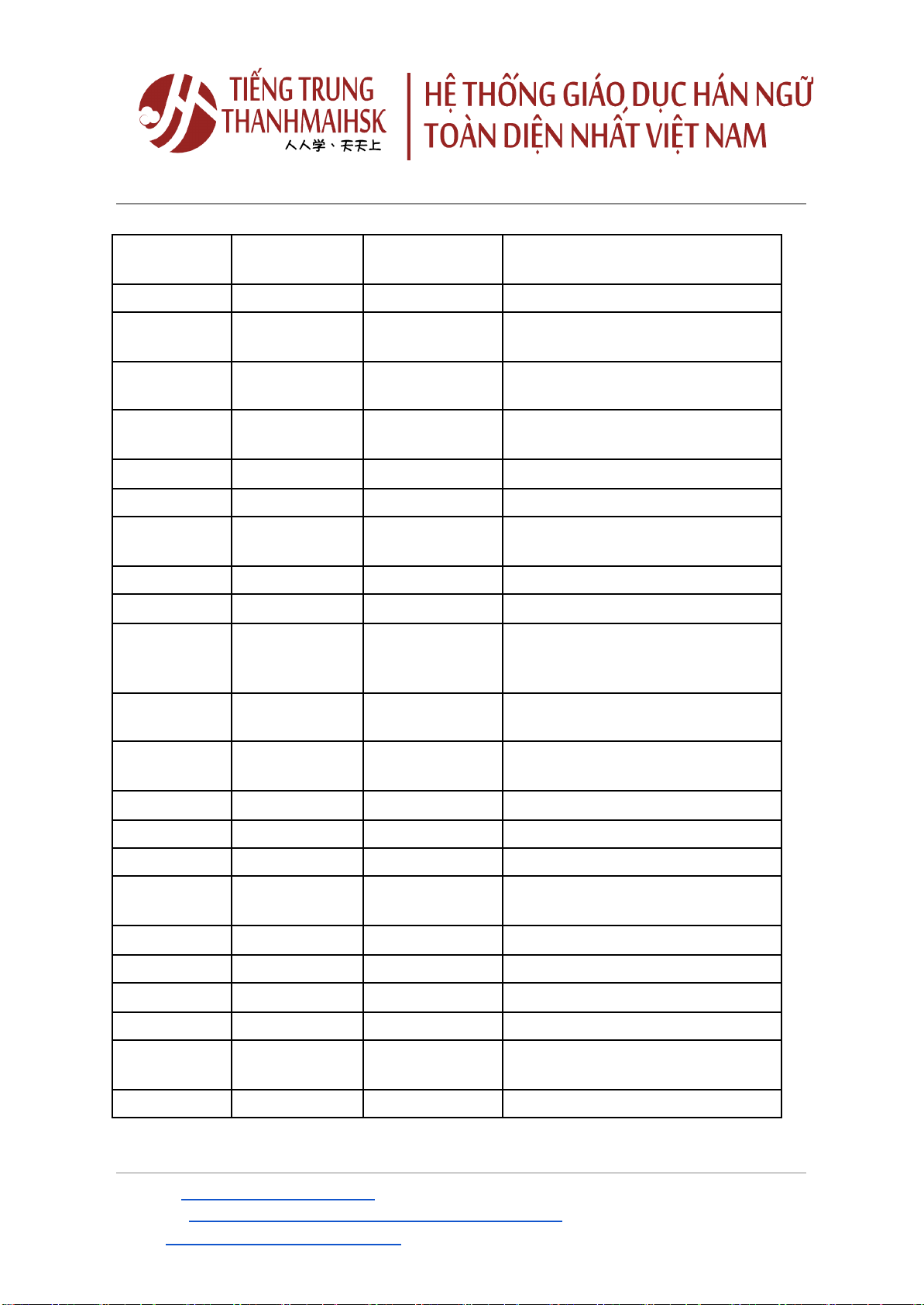 Tiktok: www.tiktok.com/@thanhmaihsk 报名 Báo danh bàomíng Động từ Báo tên Danh từ Lần 倍 bèi Lượng từ Bội Vốn dĩ, ban đầu 本来 běnlái Từ nối Có lẽ, lẽ ra, đáng lẽ 笨 bèn Tính từ Ngốc nghếch 笔记本 bǐjìběn Danh từ Sổ tay 毕业 Danh từ bìyè Tốt nghiệp Động từ 遍 biàn Lượng từ Đoạn 标准 biāozhǔn Danh từ Tiêu chuẩn Biểu đạt 表达 biǎodá Động từ Bày tỏ 表格 biǎogé Danh từ Bảng, biểu Biểu dương 表扬 biǎoyáng Động từ Tán/ tuyên dương 饼干 bǐnggān Danh từ Bánh quy Từ nối 并且 bìngqiě Hơn nữa Liên từ 博士 bóshì Danh từ Tiến sĩ bù dàn Từ nối 不但 Không những n Liên từ Từ nối
