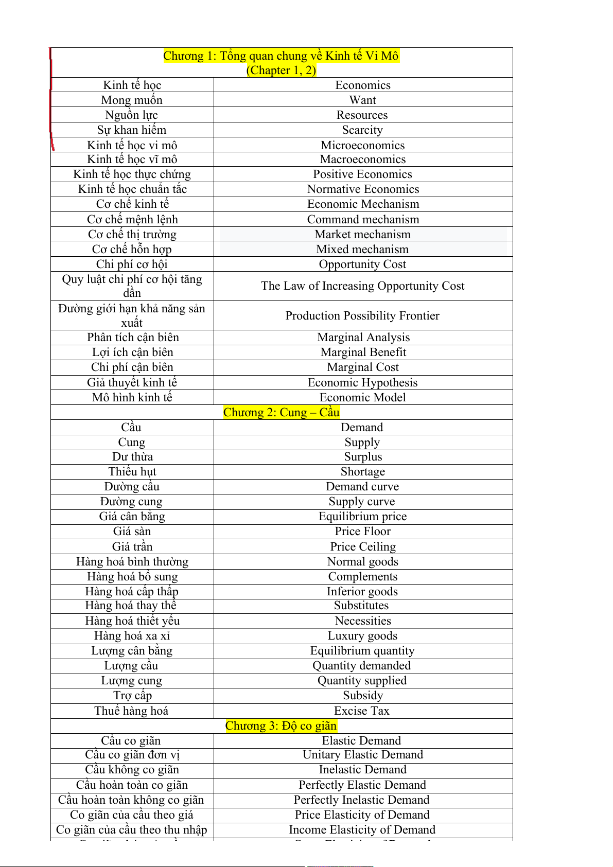 Chương 1: Tổng quan chung về Kinh tế Vi Mô (Chapter 1, 2) Kinh tế học Economics Mong muốn Want Nguồn lực Resources Sự khan hiếm Scarcity Kinh tế học vi mô Microeconomics Kinh tế học vĩ mô Macroeconomics Kinh tế học thực chứng Positive Economics Kinh tế học chuẩn tắc Normative Economics Cơ chế kinh tế Economic Mechanism Cơ chế mệnh lệnh Command mechanism Cơ chế thị trường Market mechanism Cơ chế hỗn hợp Mixed mechanism Chi phí cơ hội Opportunity Cost