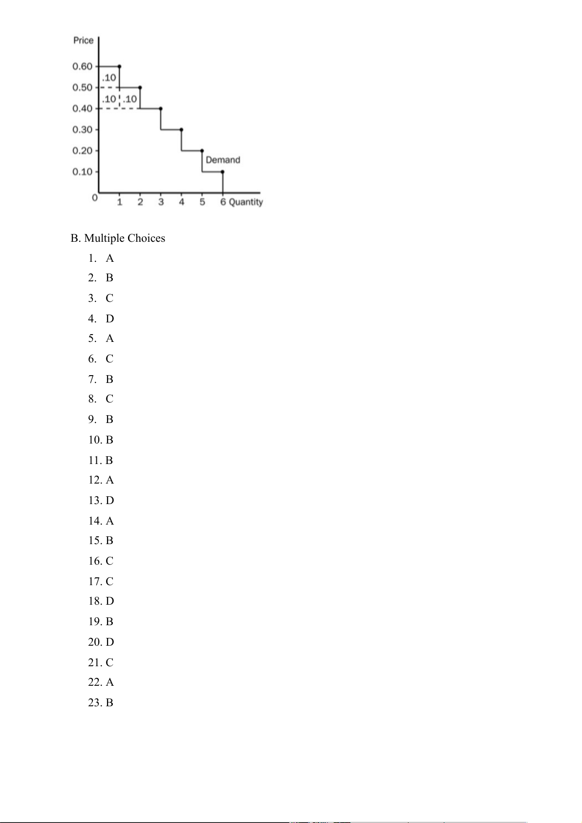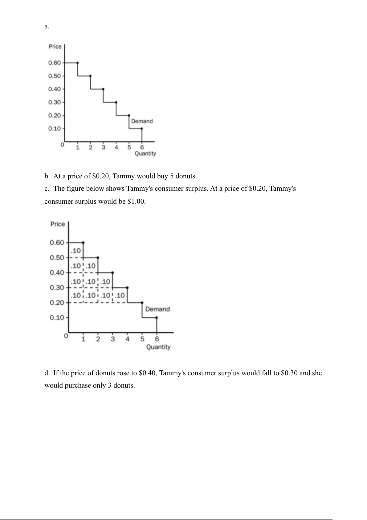 d. If the price of donuts rose to $0.40, Tammy's consumer surplus would fall to $0.30 and she would purchase only 3 donuts. B. Multiple Choices 1. A 2. B 3. C 4. D 5. A 6. C 7. B 8. C 9. B 10. B 11. B 12. A 13. D 14. A 15. B 16. C 17. C 18. D 19. B 20. D 21. C 22. A 23. B