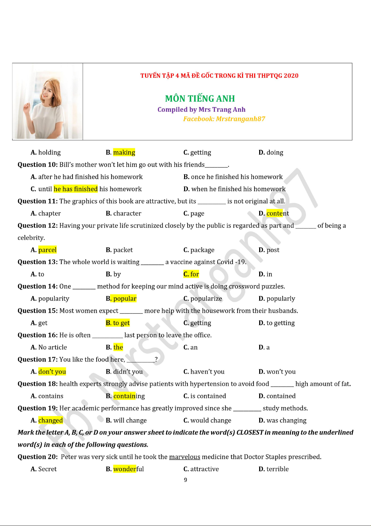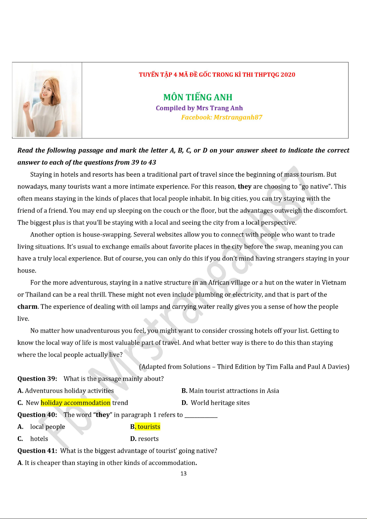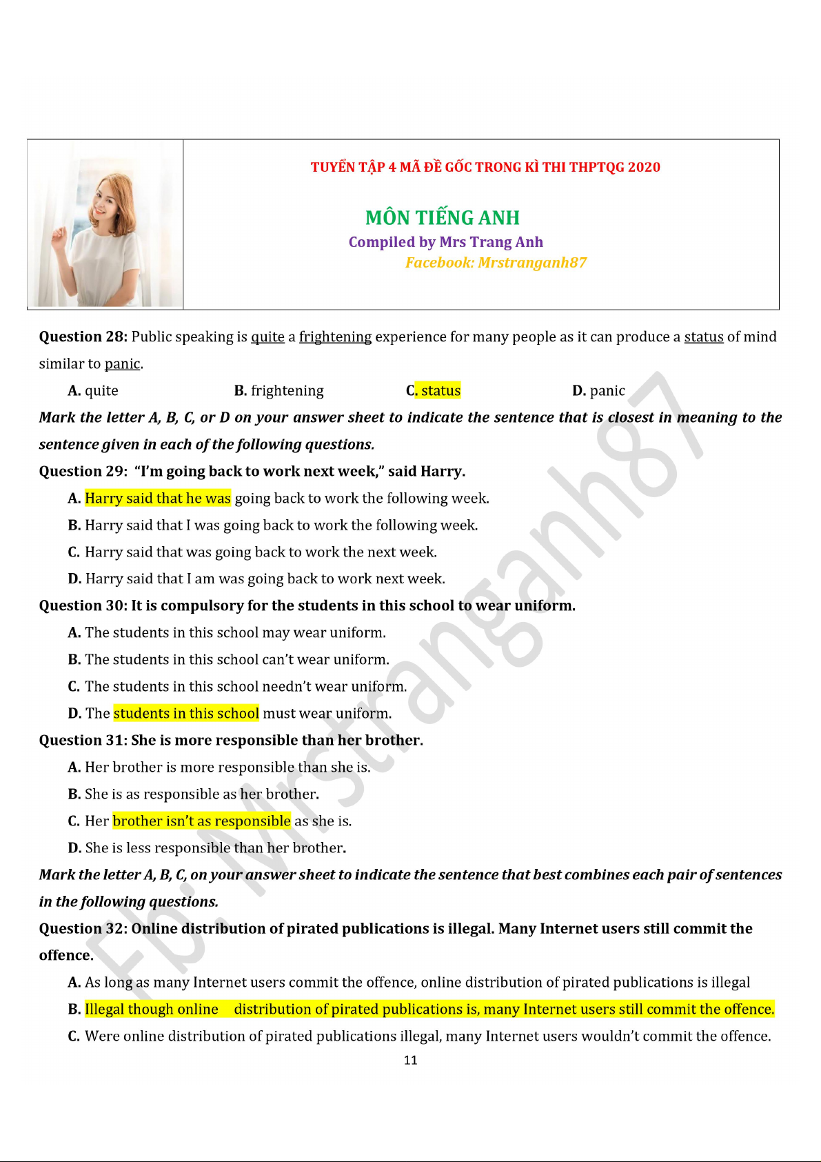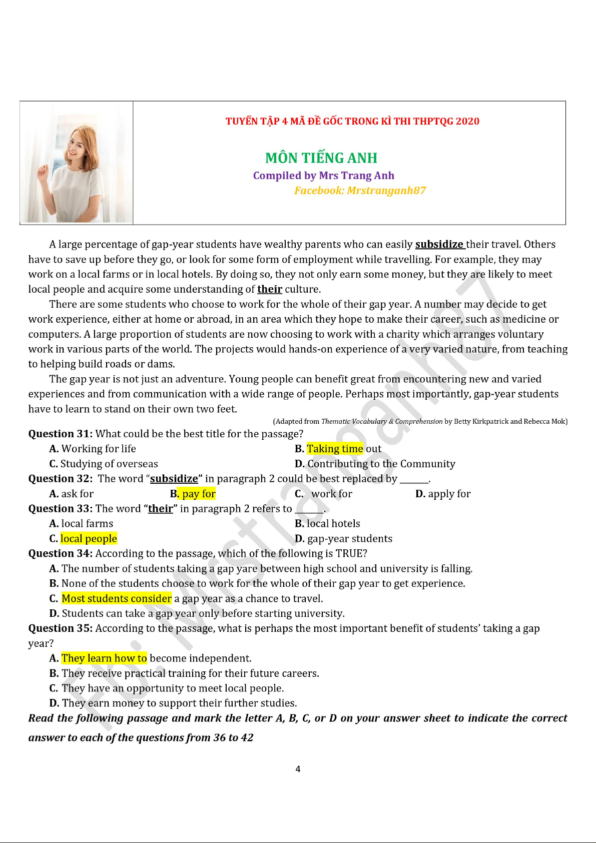 TUYỂN TẬP 4 MÃ ĐỀ GỐC - MÔN ANH 2020(KEYS)