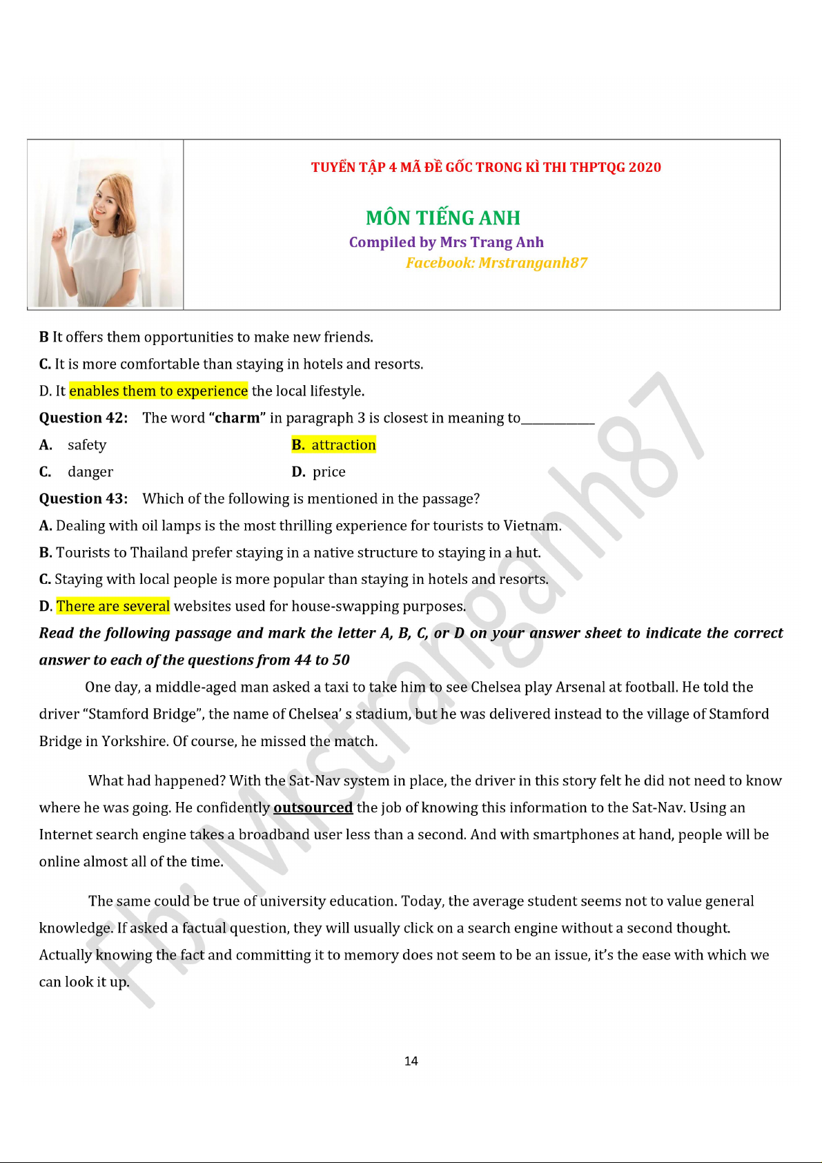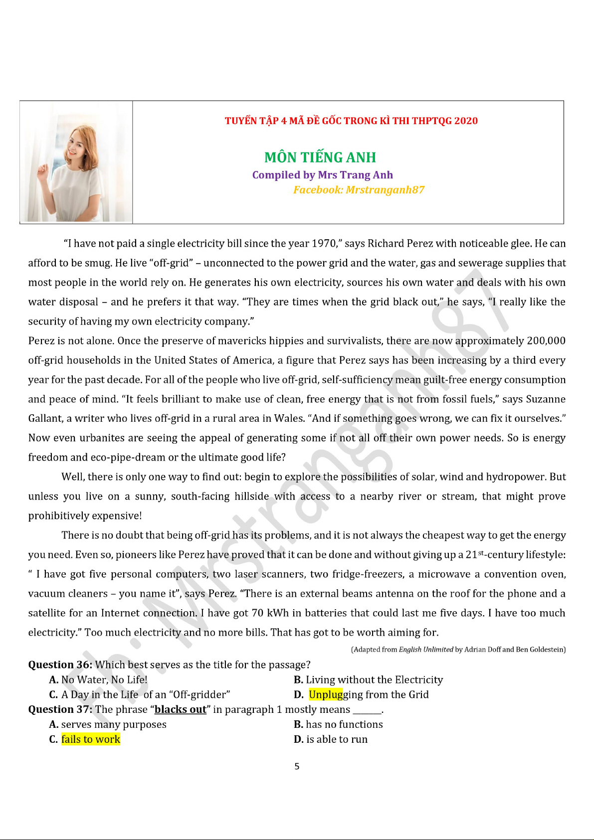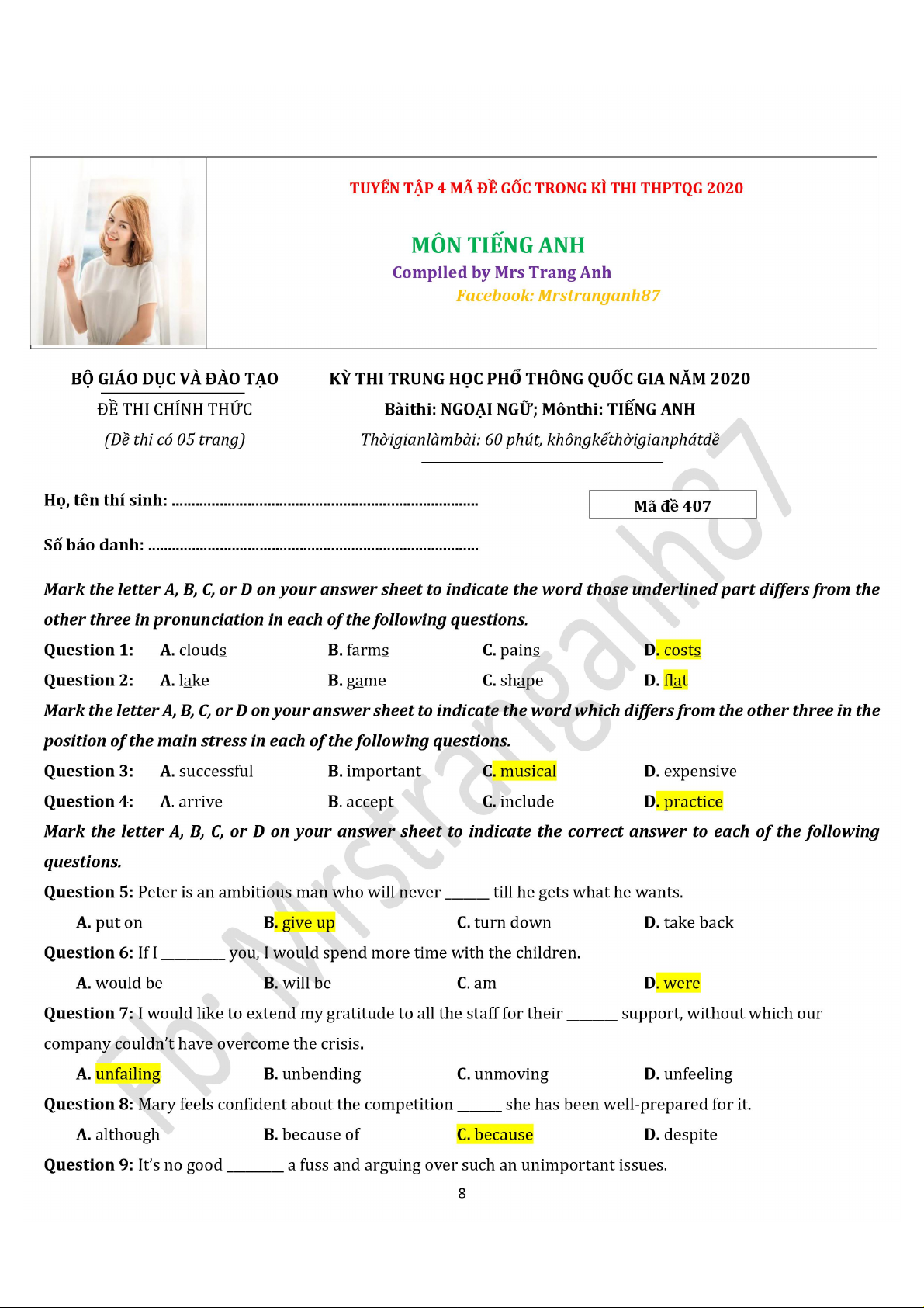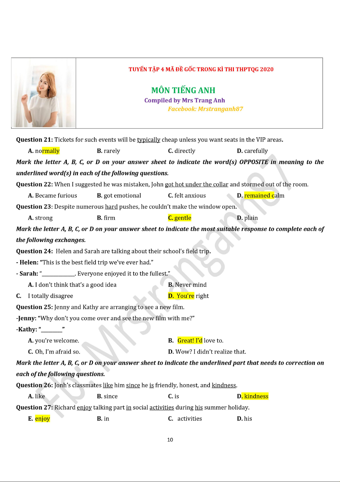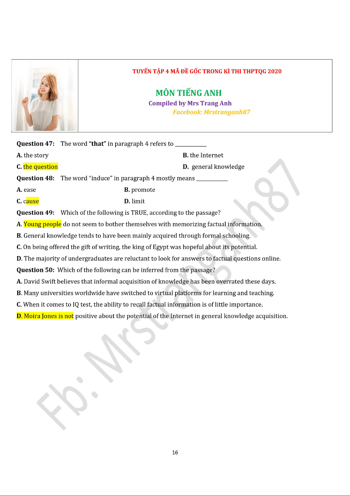 TUYỂN TẬP 4 MÃ ĐỀ GỐC - MÔN ANH 2020(KEYS)