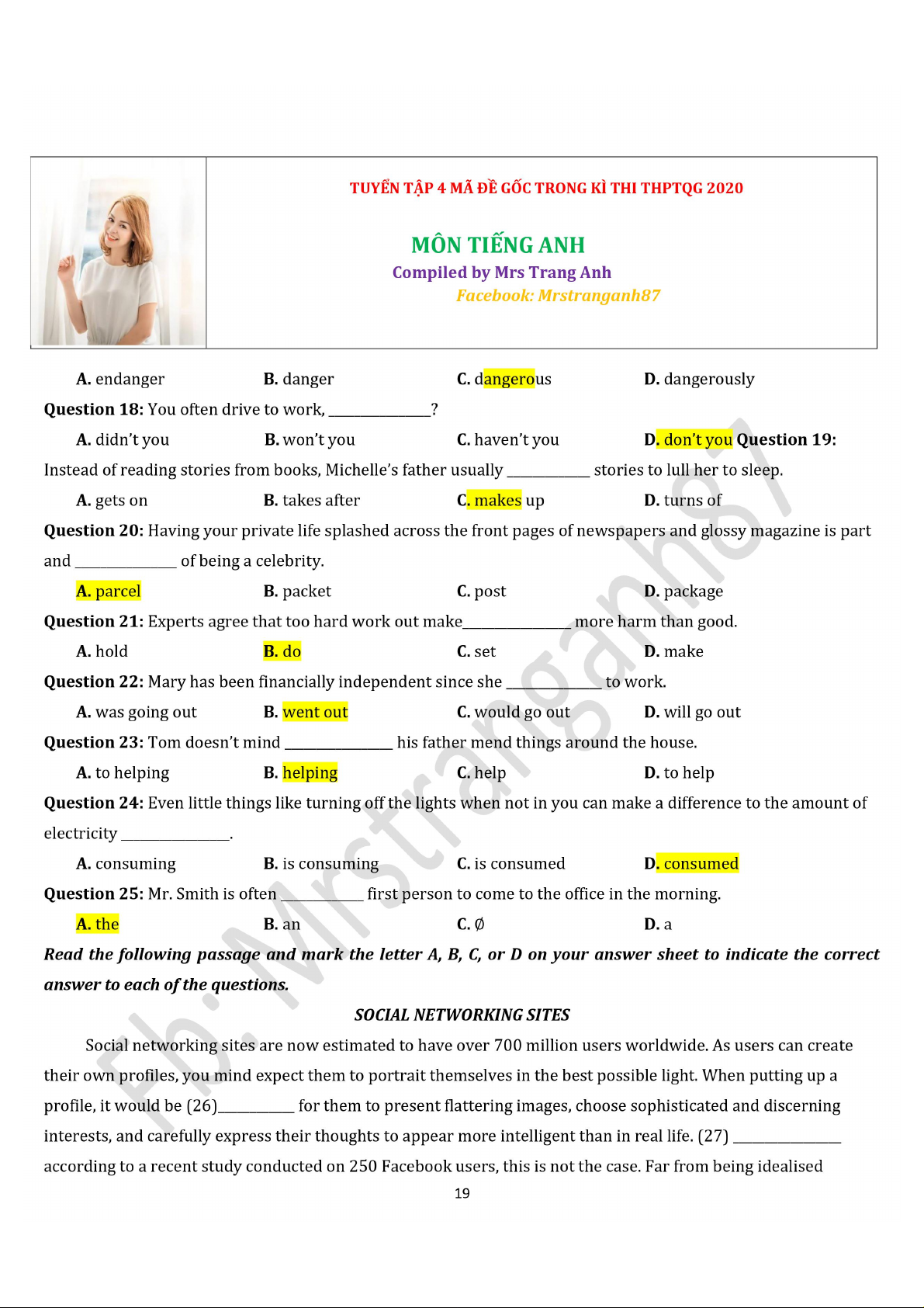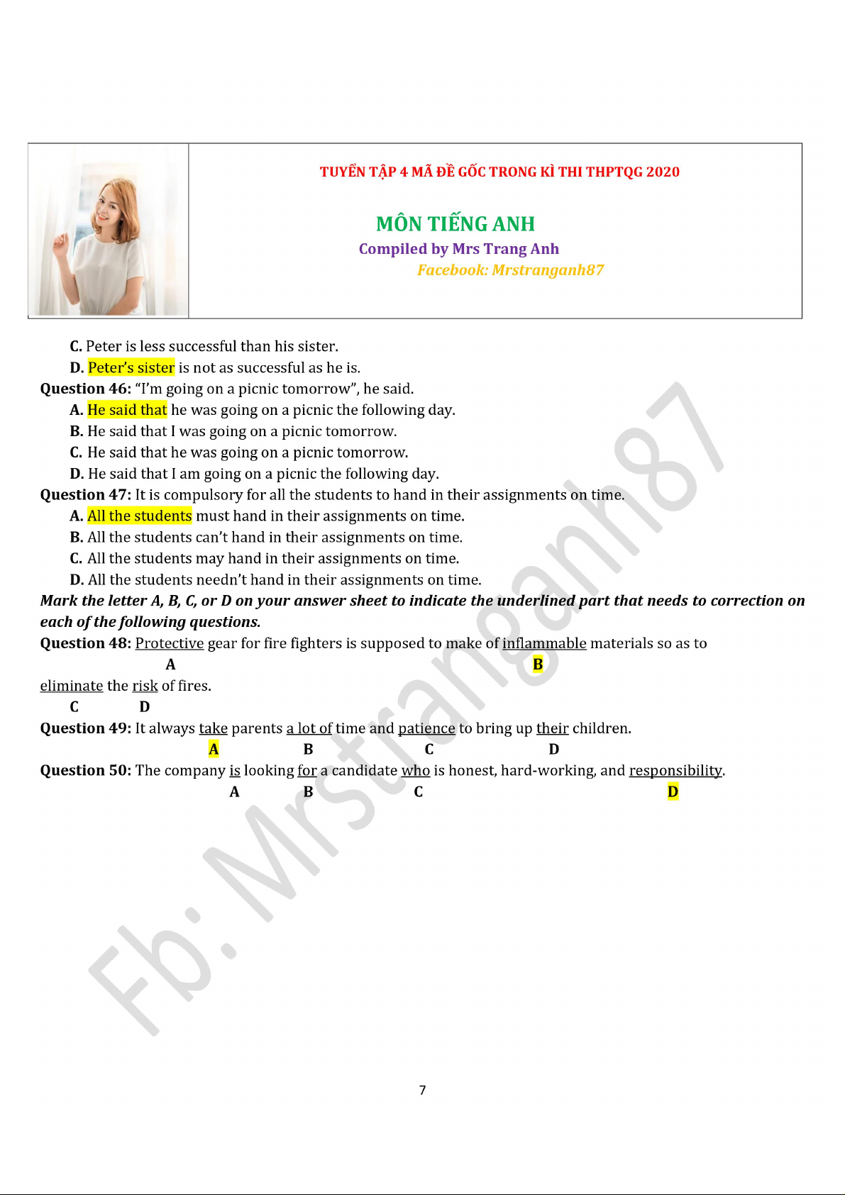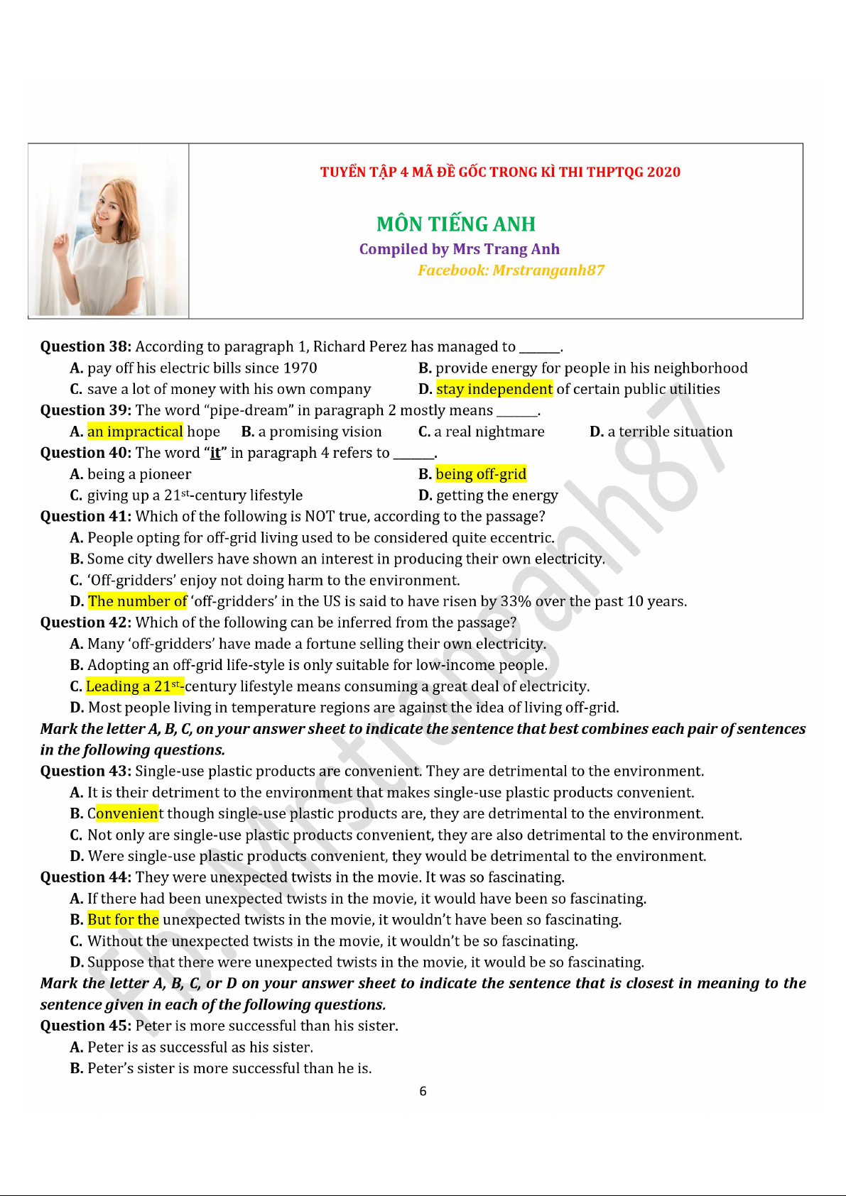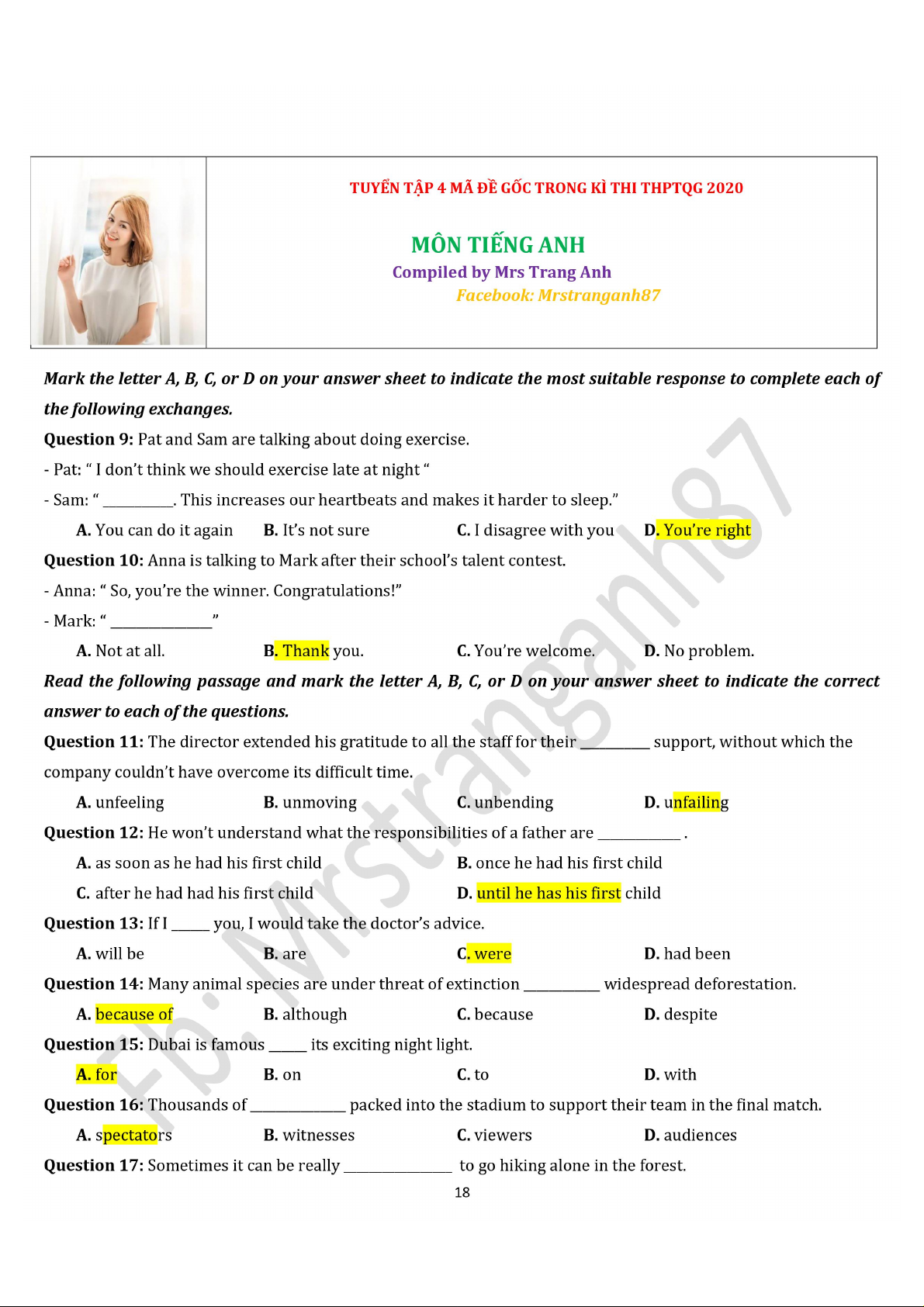 TUYỂN TẬP 4 MÃ ĐỀ GỐC - MÔN ANH 2020(KEYS)