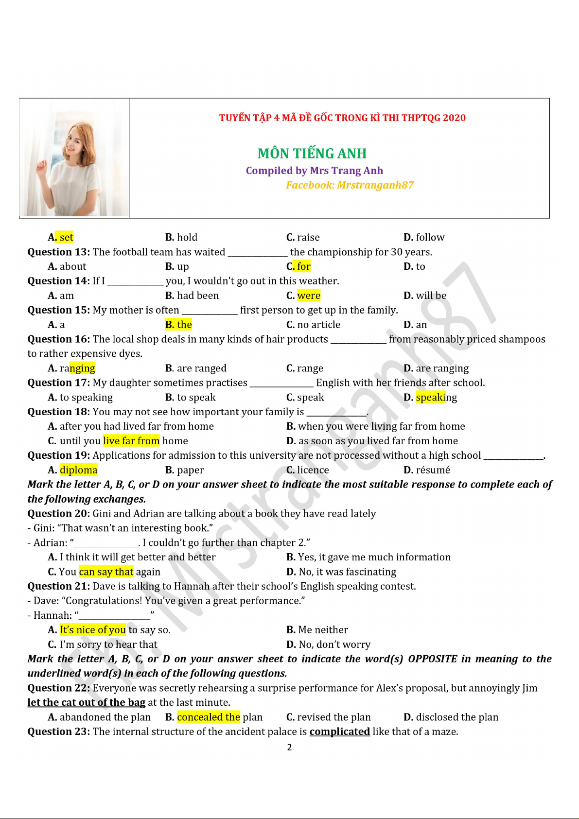 Tổng hợp 4 mã đề - Tiếng Anh 2020 (keys). Tài liệu tổng hợp được sưu tầm. Mời mọi người tham khảo