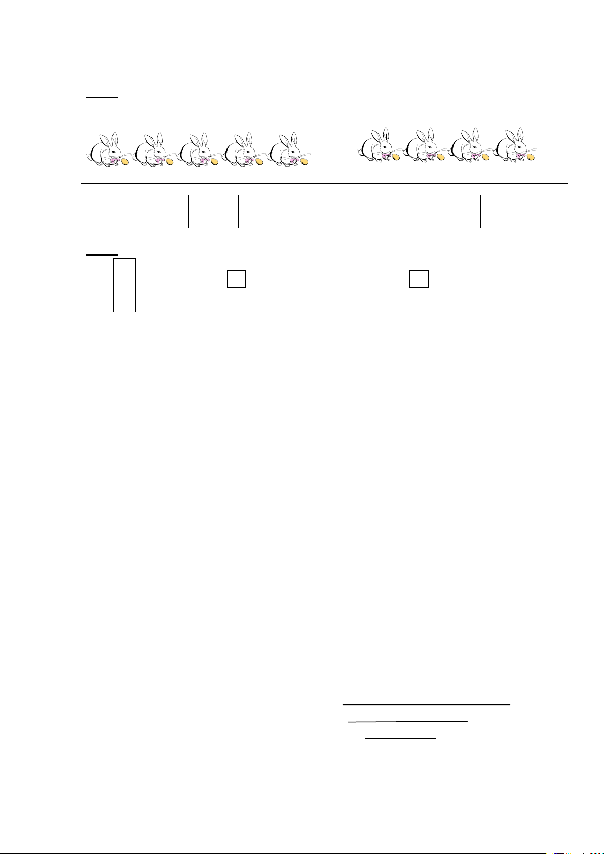 9 – 4 + 5 = . . . . . . . . Bài 3: (2 điểm) 4 + . . . = 10 9 = 5 + . . . S ? . . . + 3 = 5 8 = . . . + 6 7 – . . . = 3 10 = 10 + . . . . . . – 5 = 0 10 = . . . + 7 Bài 4: (1 điểm) < 7 + 2 2 + 7 9 – 3 6 + 2 > ? 3 + 4 10 – 5 4 + 4 4 – 4 = Bài 5: (1 điểm)