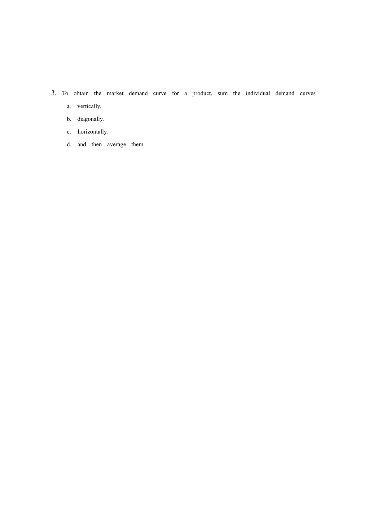 3. To obtain the market demand curve for a product, sum the individual demand curves a. vertically. b. diagonally. c. horizontally. d. and then average them.