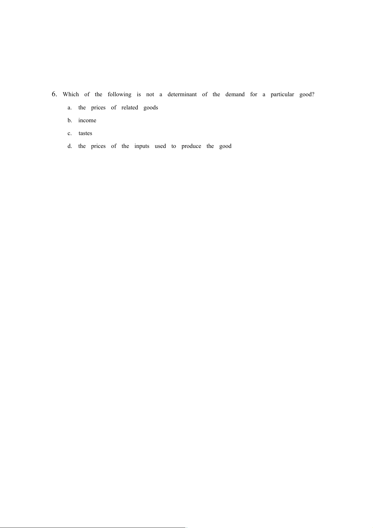 6. Which of the following is not a determinant of the demand for a particular good? a. the prices of related goods b. income c. tastes