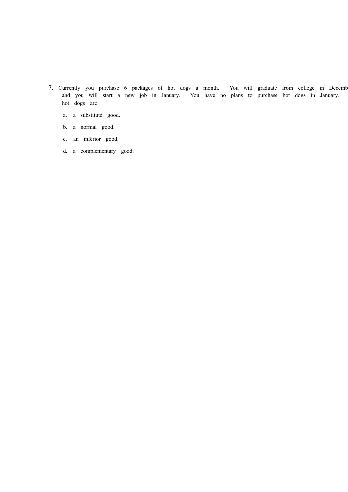 and you will start a new job in January. You have no plans to purchase hot dogs in January. hot dogs are a. a substitute good. b. a normal good. c. an inferior good. d. a complementary good.