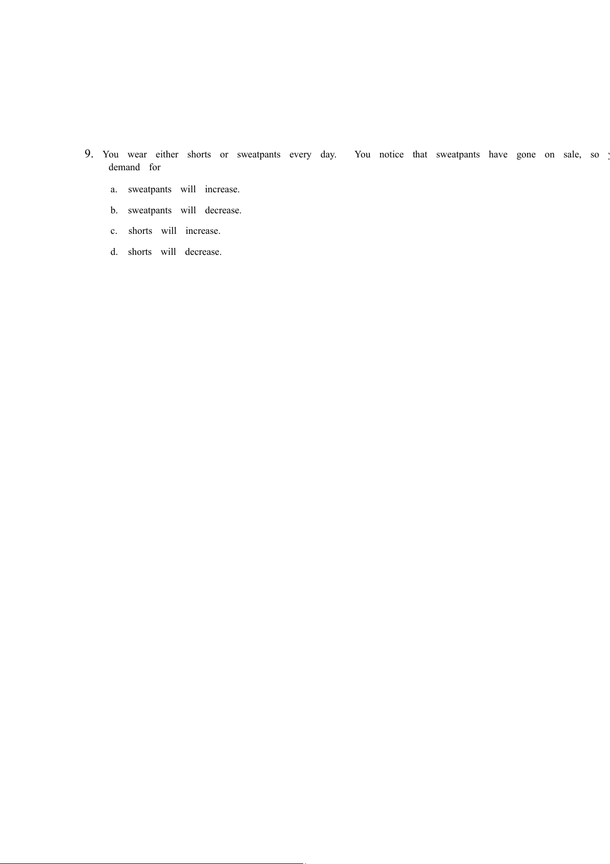 9. You wear either shorts or sweatpants every day. You notice that sweatpants have gone on sale, so y demand for a. sweatpants will increase. b. sweatpants will decrease. c. shorts will increase. d. shorts will decrease.