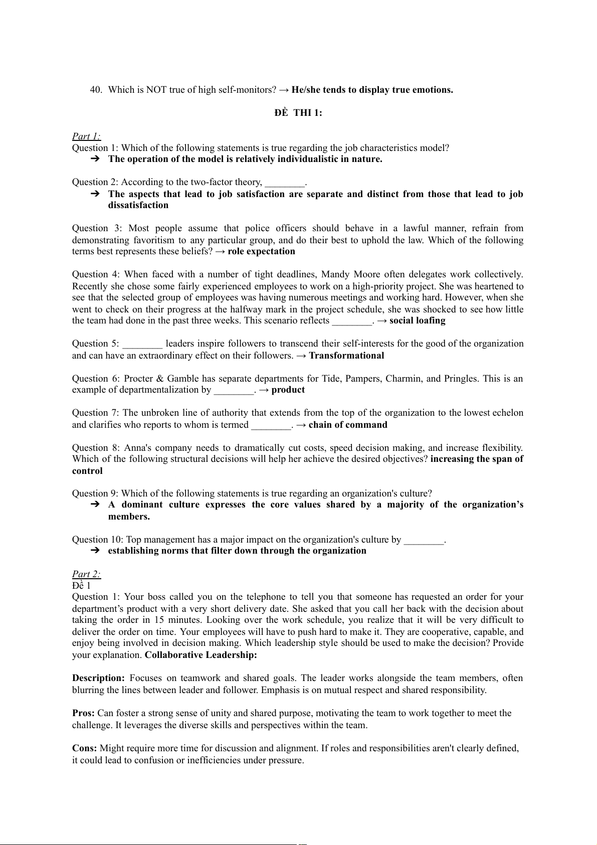 40. Which is NOT true of high self-monitors? → He/she tends to display true emotions. ĐỀ THI 1: Part 1:
