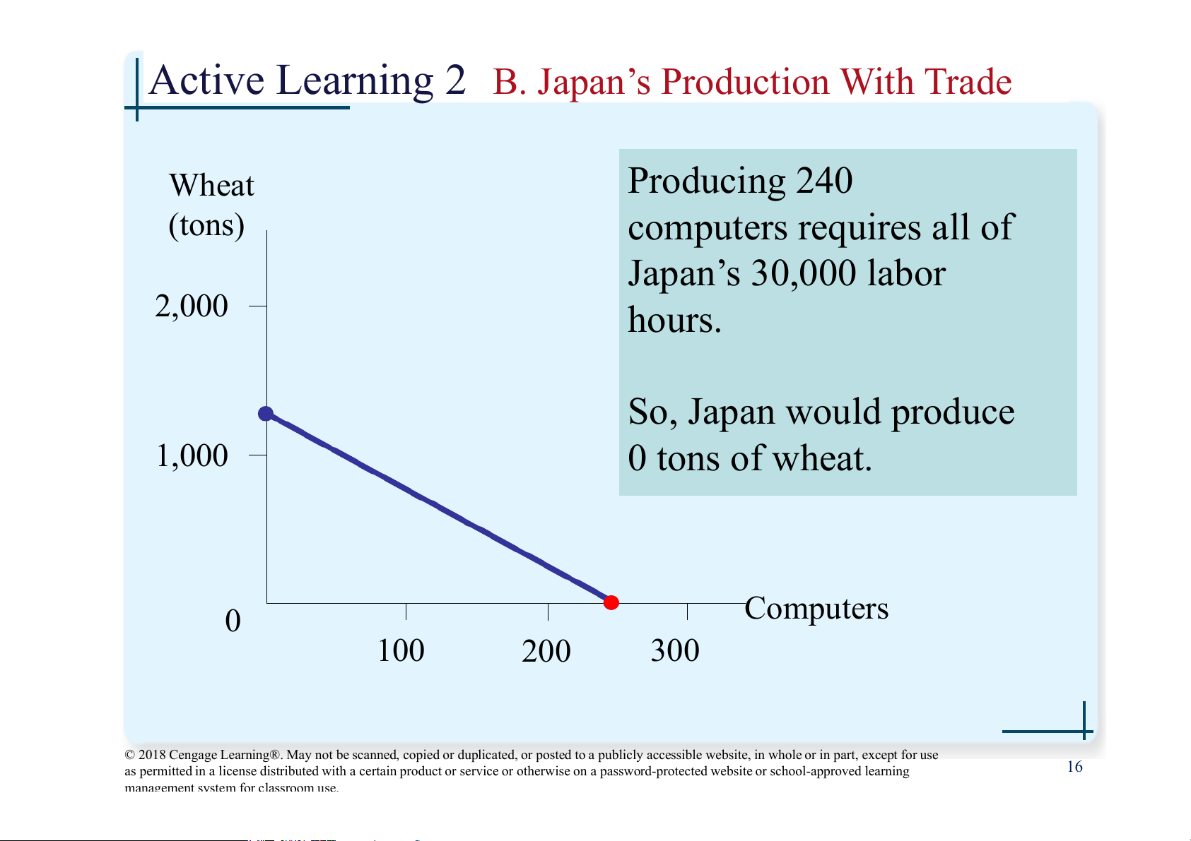 Active Learning 2 B. Japan’s Production With Trade Wheat Producing 240 (tons) computers requires all of Japan’s 30,000 labor 2,000 hours. So, Japan would produce 1,000 0 tons of wheat. Computers 0 100 200 300