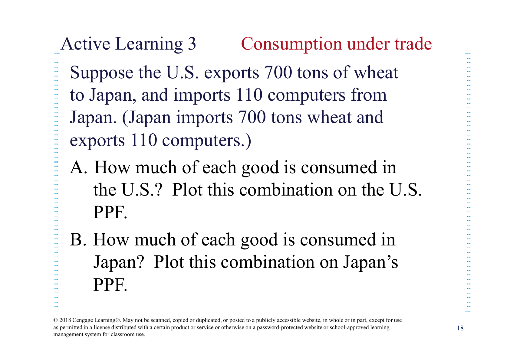 Active Learning 3 B. Japan’s Consumption With Trade computers wheat Wheat produced 240 0 (tons) + imported 0 700 2,000 – exported 110 0 = amount 130 700 consumed 1,000 Computers 0 100 200 300