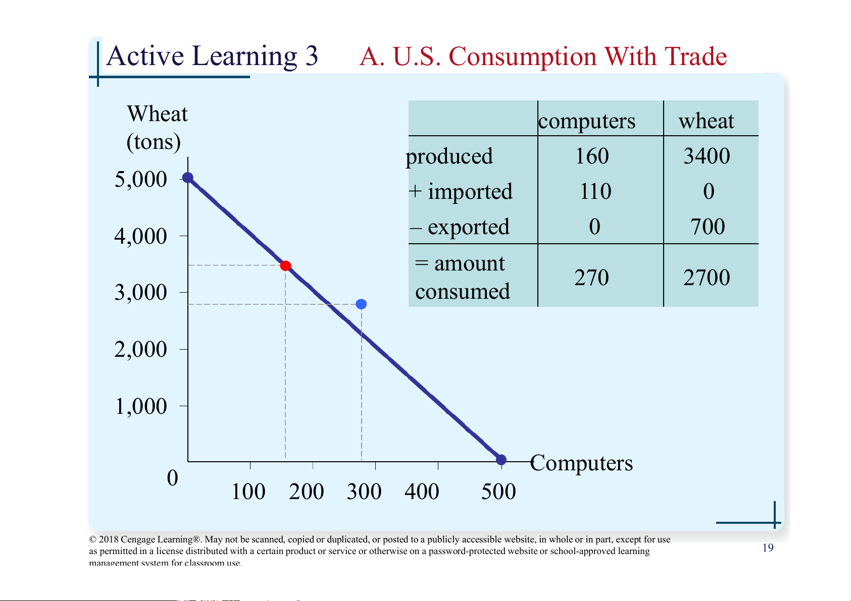 Active Learning 3 A. U.S. Consumption With Trade Wheat computers wheat (tons) produced 160 3400 5,000 + imported 110 0 4,000 – exported 0 700 = amount 270 2700 3,000 consumed 2,000 1,000 Computers 0 100 200 300 400 500