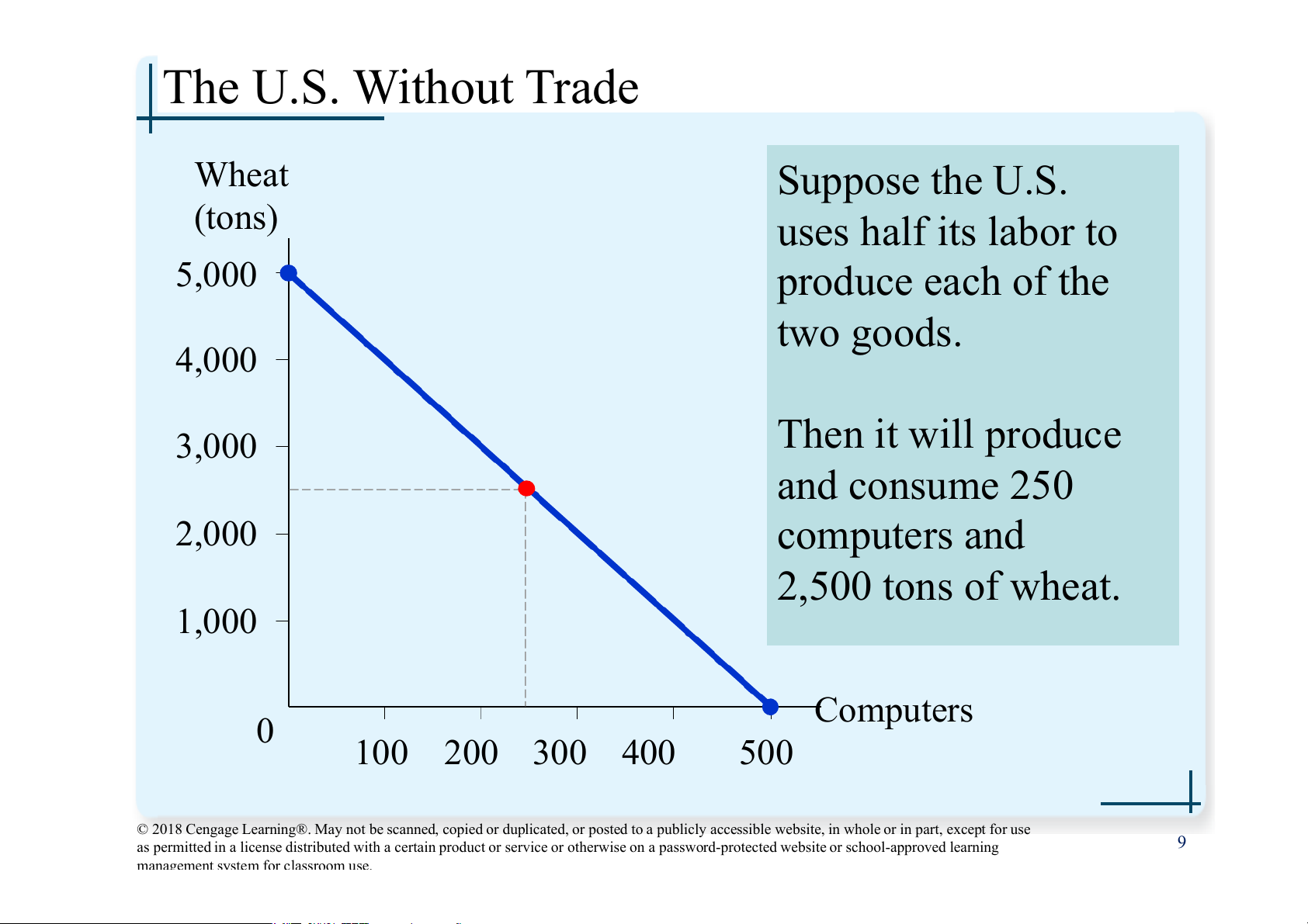 management system for classroom use. The U.S. Without Trade Wheat Suppose the U.S. (tons) uses half its labor to 5,000 produce each of the two goods. 4,000 Then it will produce 3,000 and consume 250 2,000 computers and 2,500 tons of wheat. 1,000 Computers 0 100 200 300 400 500