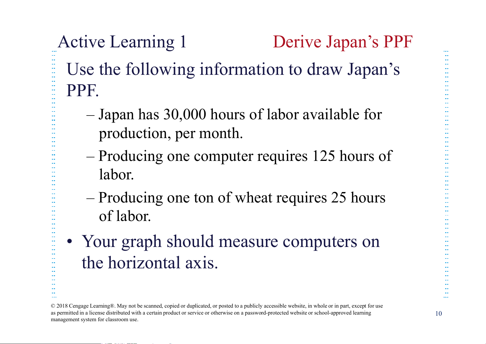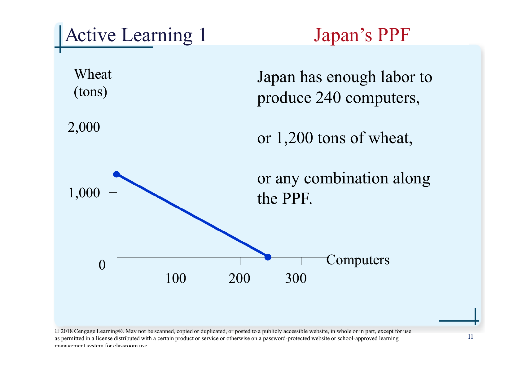 management system for classroom use. Active Learning 1 Japan’s PPF Wheat Japan has enough labor to (tons) produce 240 computers, 2,000 or 1,200 tons of wheat, or any combination along 1,000 the PPF. Computers 0 100 200 300