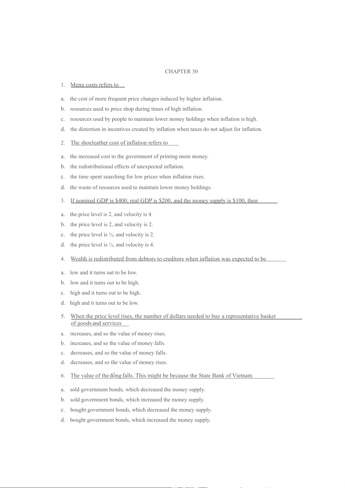 16. When prices are falling, economists say that there is a. disinflation. b. a contraction. c. an inverted inflation. d. Deflation 17. Last year, Lan spent all of her income to purchase 200 breads at 20,000 VND per bread. This year, she spent all of her income to purchase 180 breads at 25,000 VND per bread.