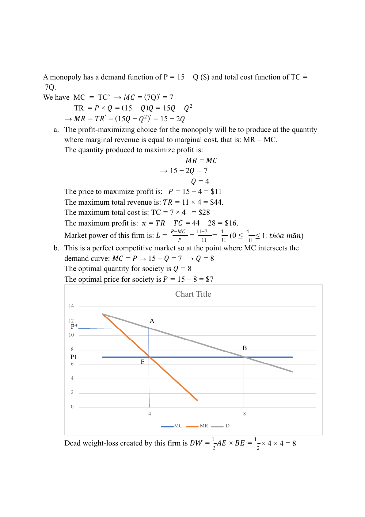 A monopoly has a demand function of P = 15 − Q ($) and total cost function of TC = 7Q.